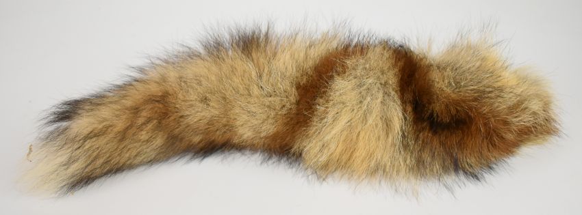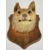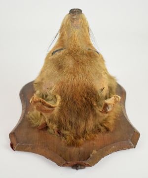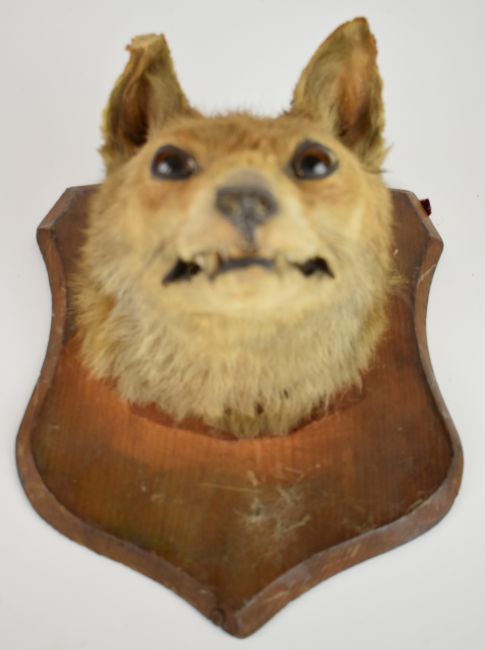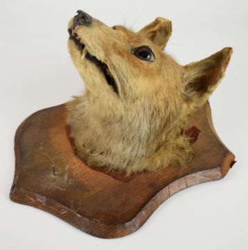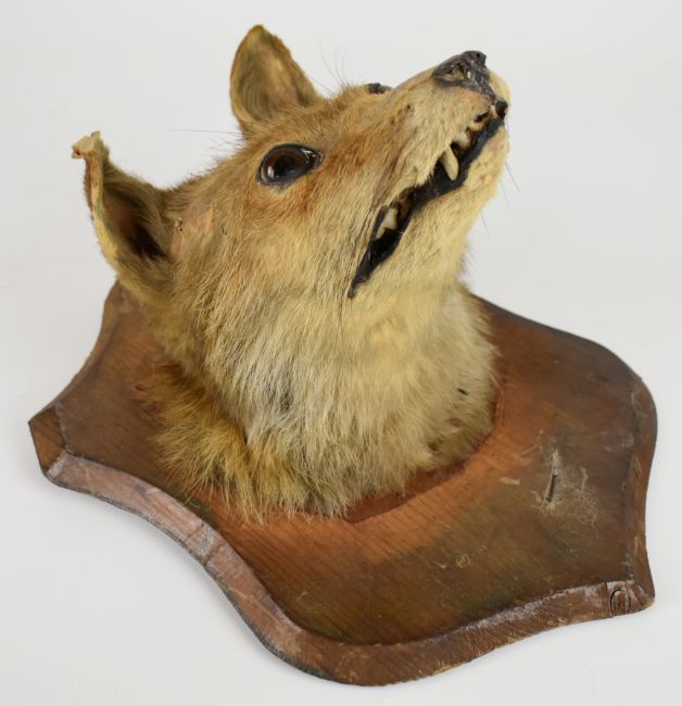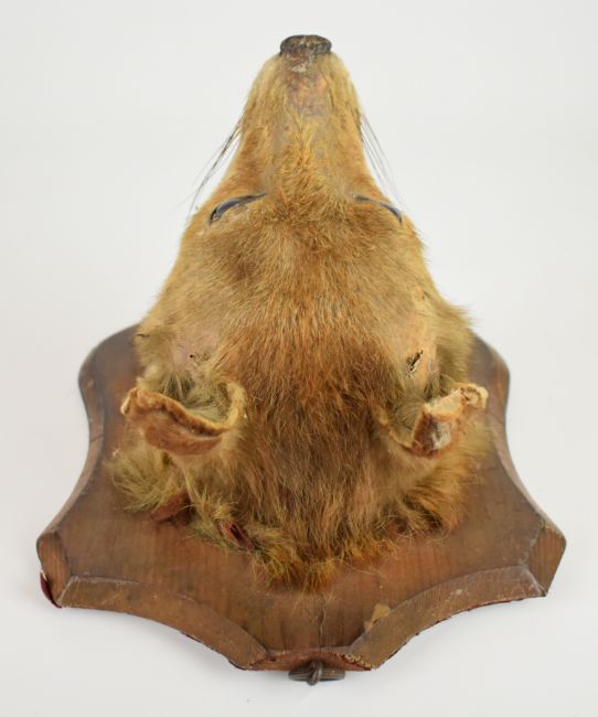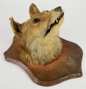 Taxidermy fox mask and brush mounted on a wooden shield plaque with suspension loop, H30cm, 64cm with brush