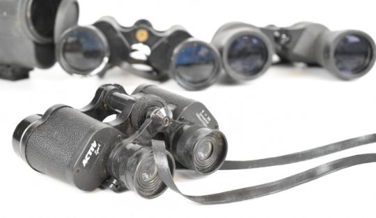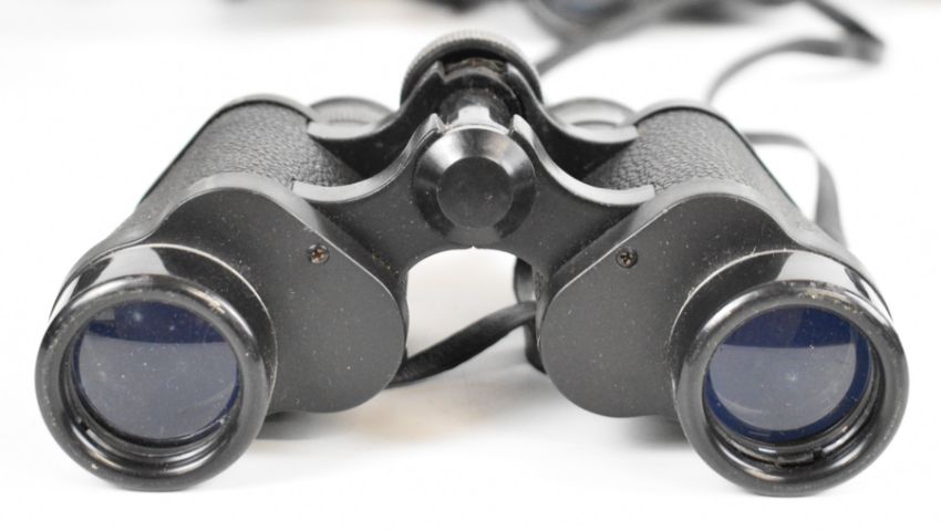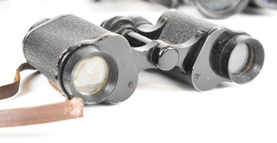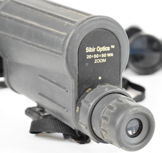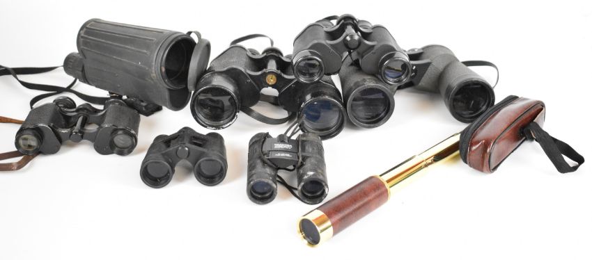 Sibir Optics 20-50 x 50 WA zoom spotting or similar scope, 25x30mm three draw telescope and six various pairs of binoculars to include Zenith 10x50, Praktica Sport 10x25 and Commodore 12x50