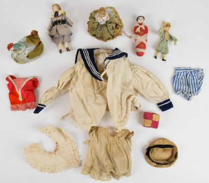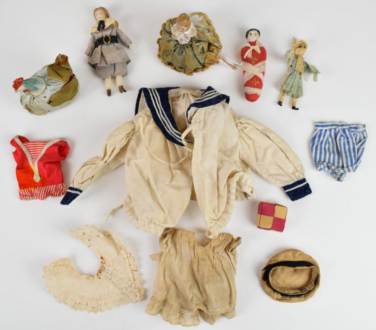19thC and later half dolls including cockerel and mummy, pin cushion, miniature dolls, one possibly Georgian, dolls clothes etc, tallest 11cm