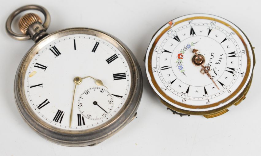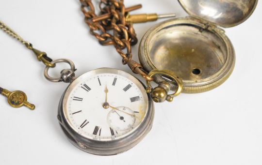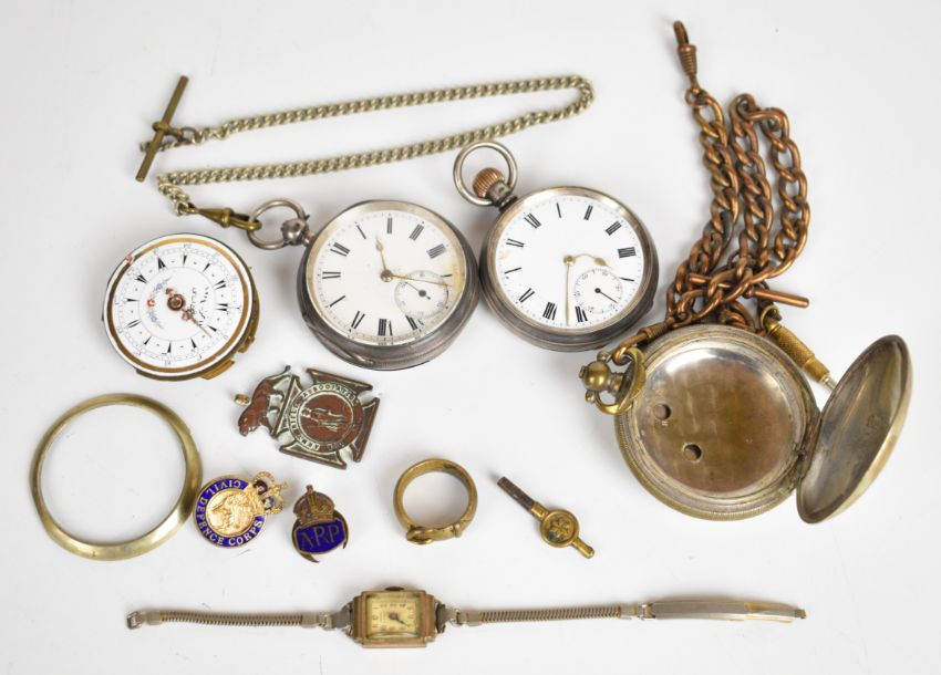 Two silver pocket watches, silver cased pocket watch, badges etc