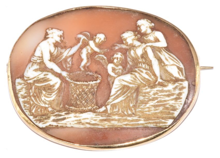 Victorian brooch set with a shell cameo depicting classical scene, 12.2g, 5.4 x 4.3cm (tests as 9ct gold)