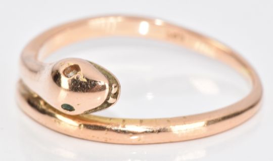 A 14k rose gold ring in the form of a serpent set with one emerald eye (the other emerald missing), 3.1g, size N