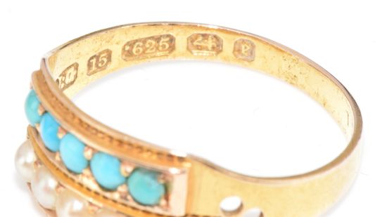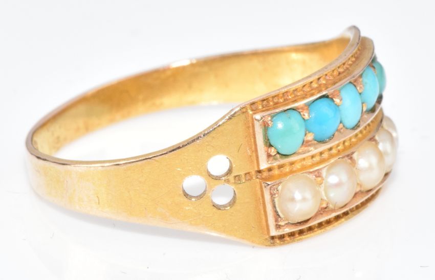A 15ct gold ring set with turquoise and pearl cabochons, Birmingham 1879, 2.4g, size N/O