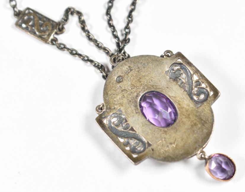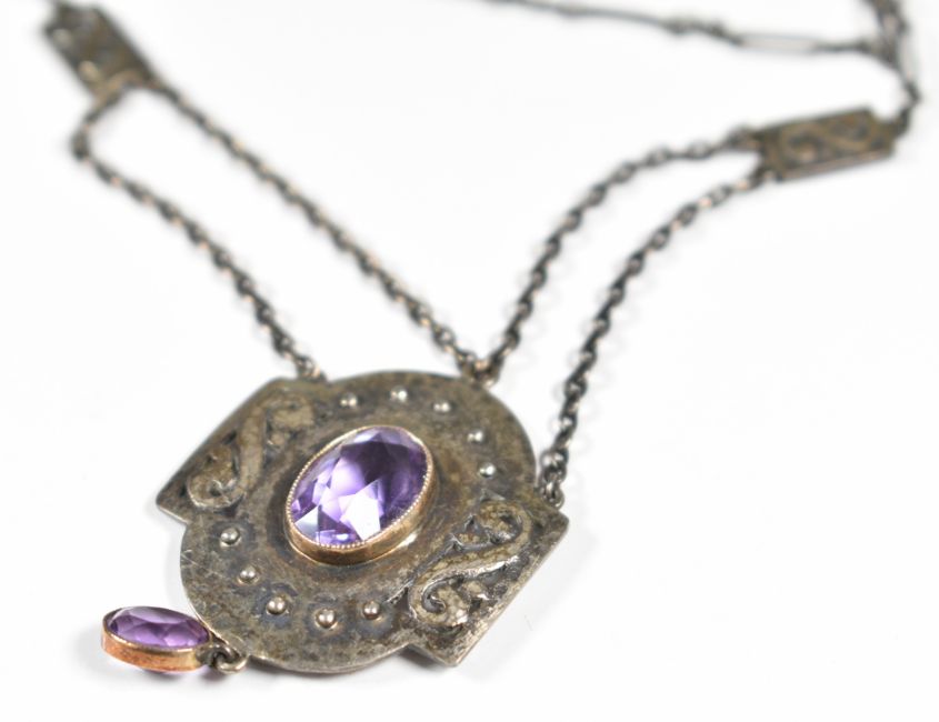 Murrle Bennett silver Arts & Crafts necklace with hammered decoration set, with two oval cut amethysts, 11.6g