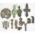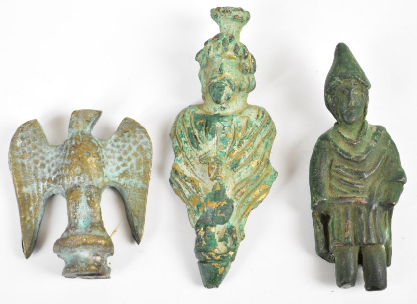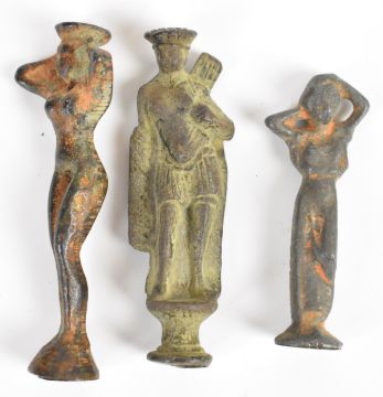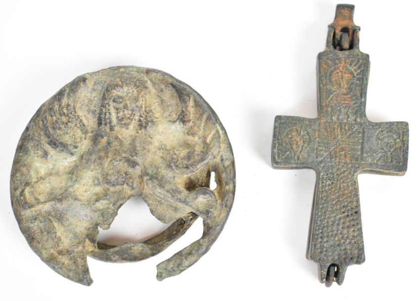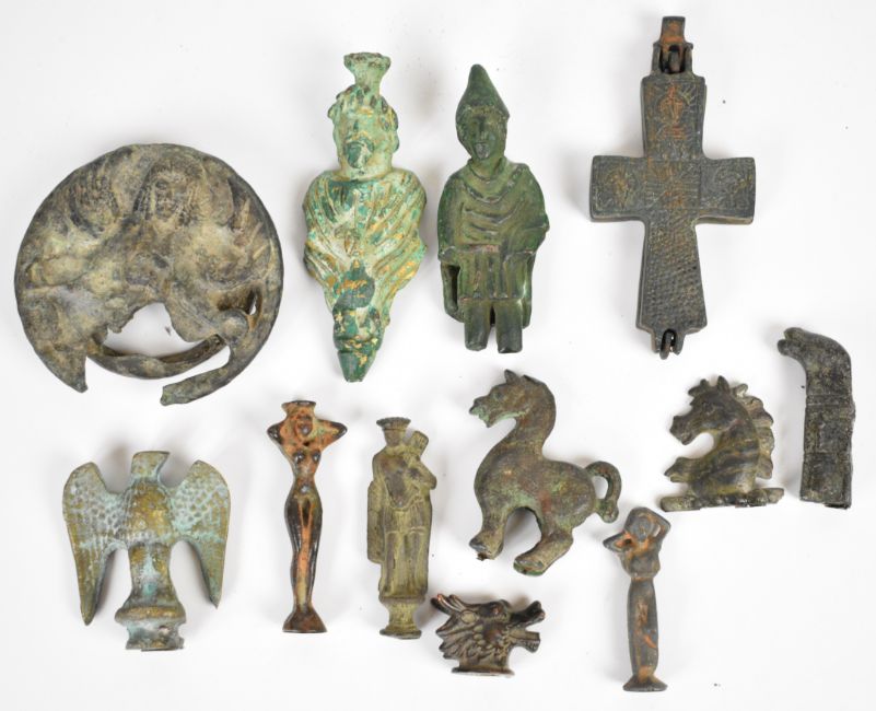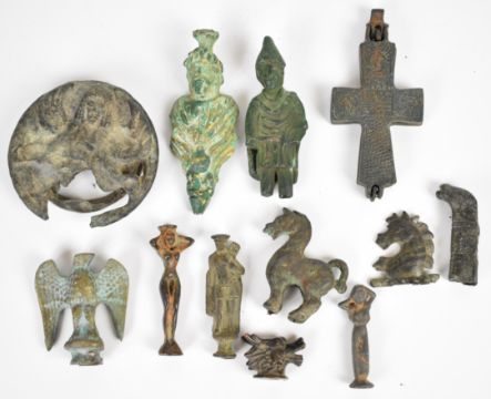 Metal detector finds and collectibles including possible Roman, Byzantine hinged cross, Phoenician figural lid, pilgrim figure, tampers, Egyptian shabti etc