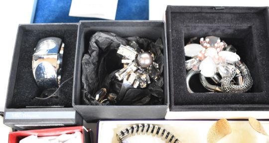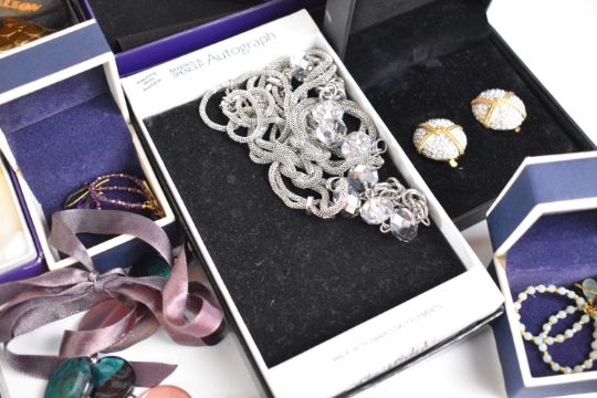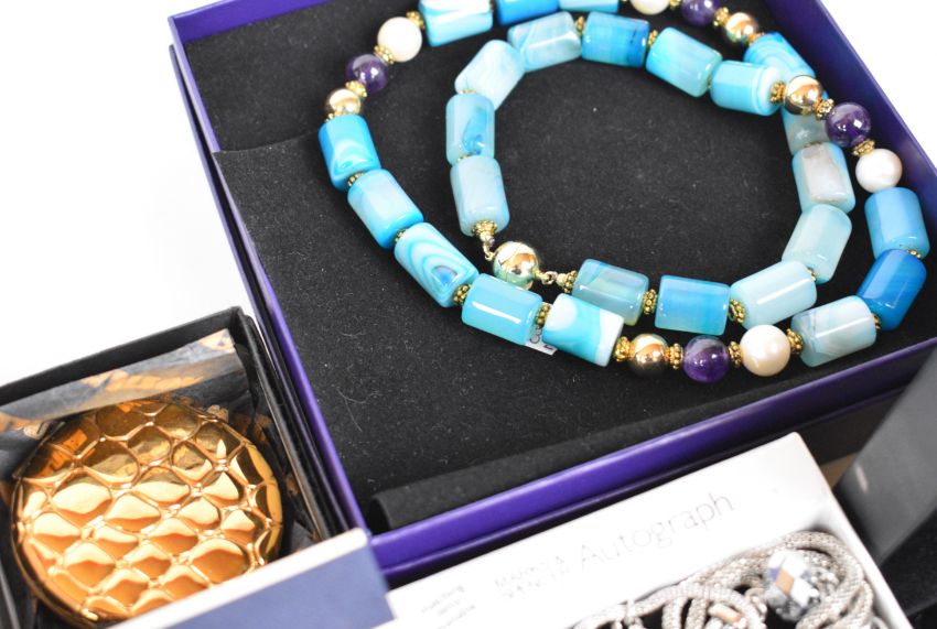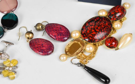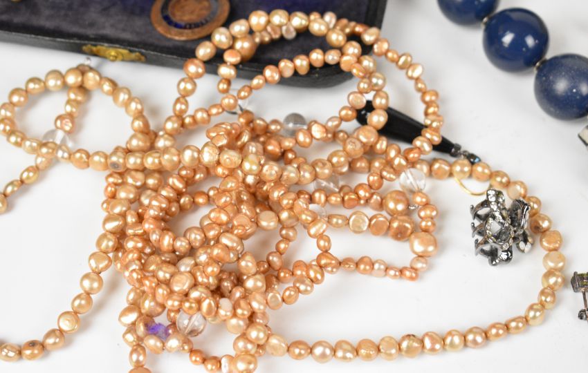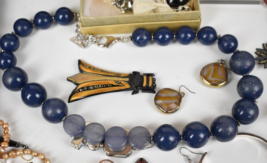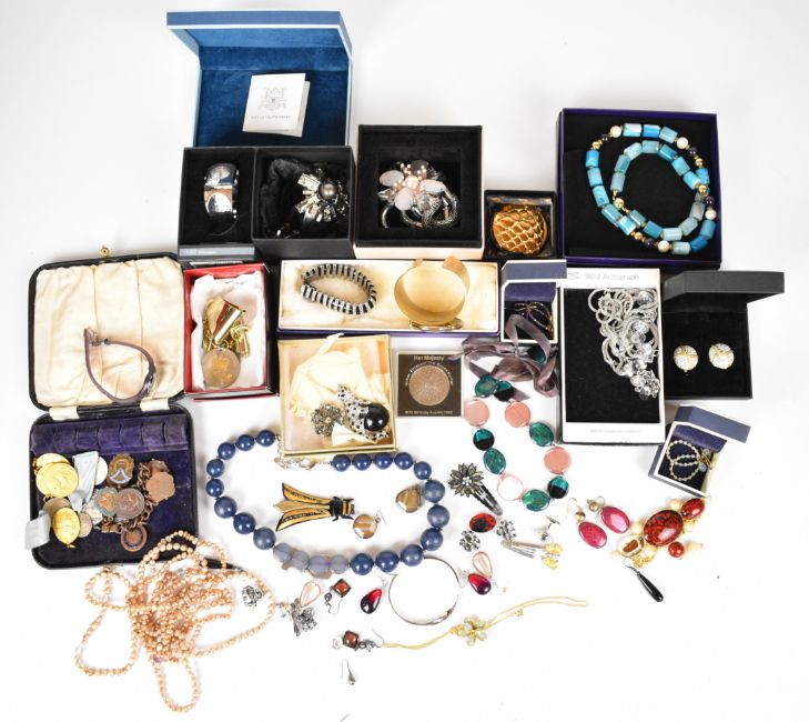 A collection of costume jewellery including two silver fobs / medallions, Swarovski earrings, Jaeger bangle set with agate, amethyst, agate and pearl beaded necklace, silver earrings, Pilgrim necklace, Art Deco beetle brooch, pearl necklace, amethyst earrings, etc