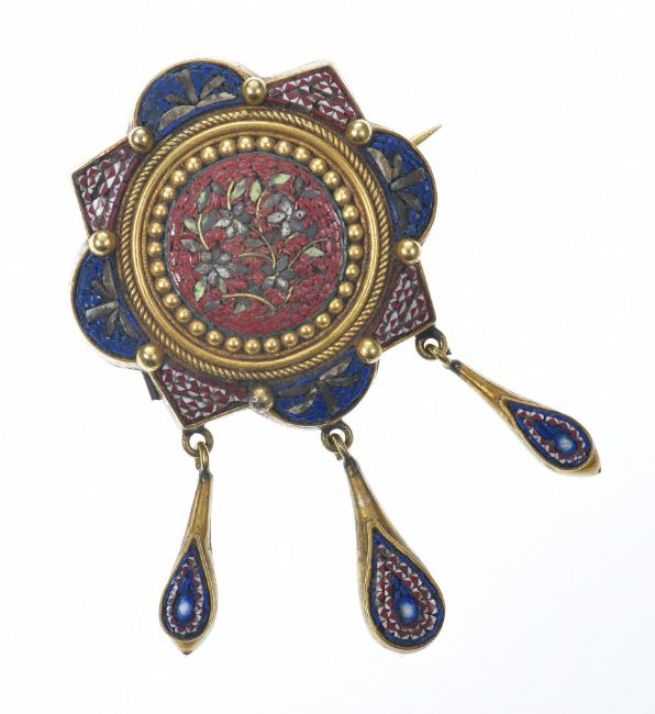 A 19thC yellow metal brooch set with micro mosaic depicting foliage, with three drop sections, in antique box, 13.2g, 2.8 x 5cm