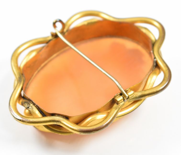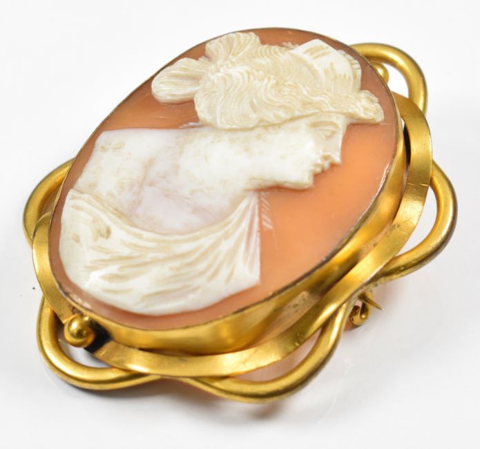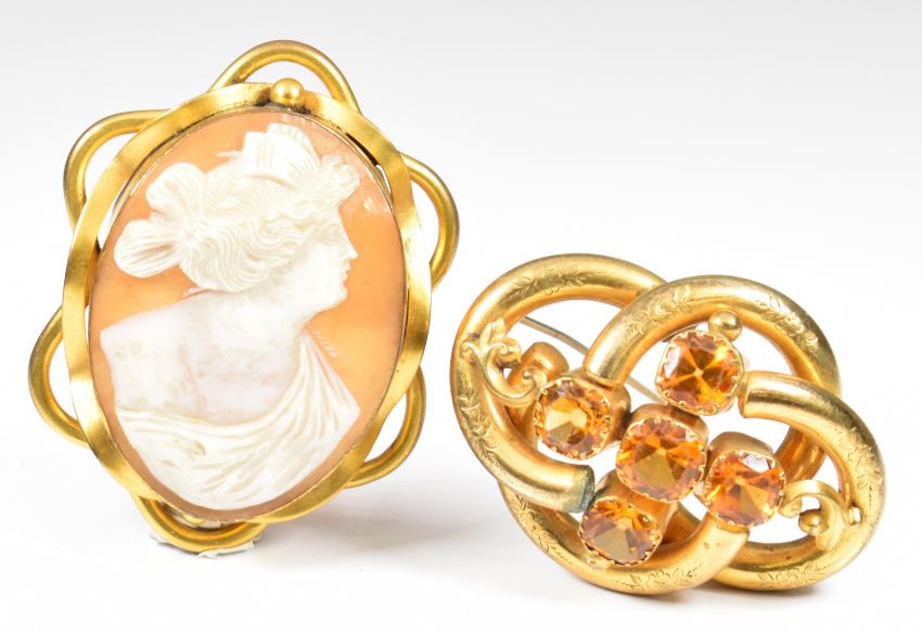 Two Victorian pinchbeck brooches, one set with paste and the other a cameo of a young woman, 6.5 x 4.5cm & 5.5 x 4.5cm