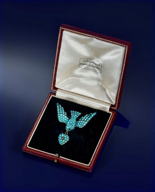 Victorian brooch in the form of a swallow set with turquoise cabochons and garnet eyes holding a drop heart set with an old cut diamond and further turquoise cabochons, verso a locket compartment and engraved feathers, in original fitted box 'Shapland, London', 14.8g, 4.5cm