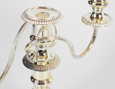 Pair of silver plated candelabra in storage / carry case, height 26cm