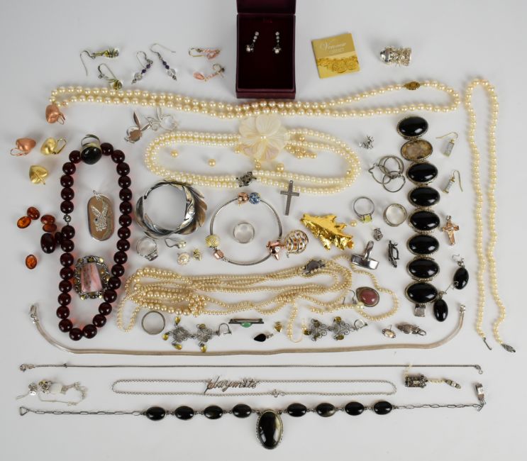 A collection of jewellery including Mexican silver suite of jewellery comprising bracelet, earrings, ring and necklace; six silver rings, faux pearls, Avon brooch, three silver pendants, pearl necklace, puzzle ring, etc (silver approximately 70g)