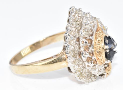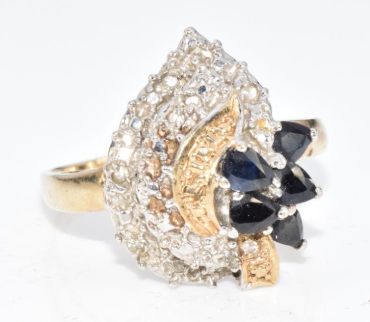A 9ct gold bi-coloured ring set with pear cut sapphires and diamonds, 4.3g, size Q