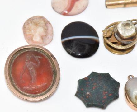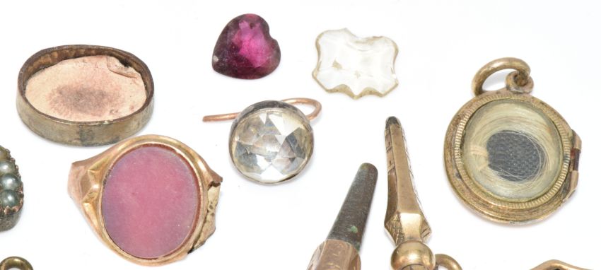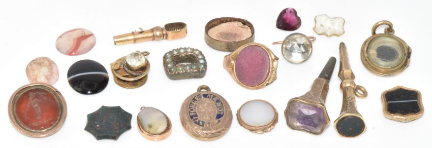 A collection of Victorian items including intaglio seal depicting a woman and bird, 'forget me not' locket, three watch keys, gilt stud in the form of a serpent set with paste, single paste earring, six agate plaques, etc