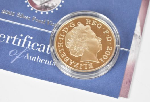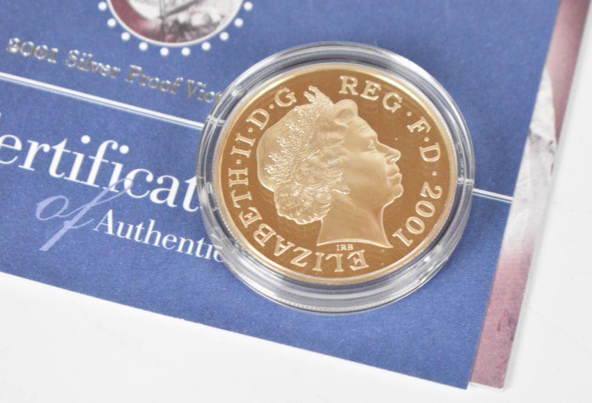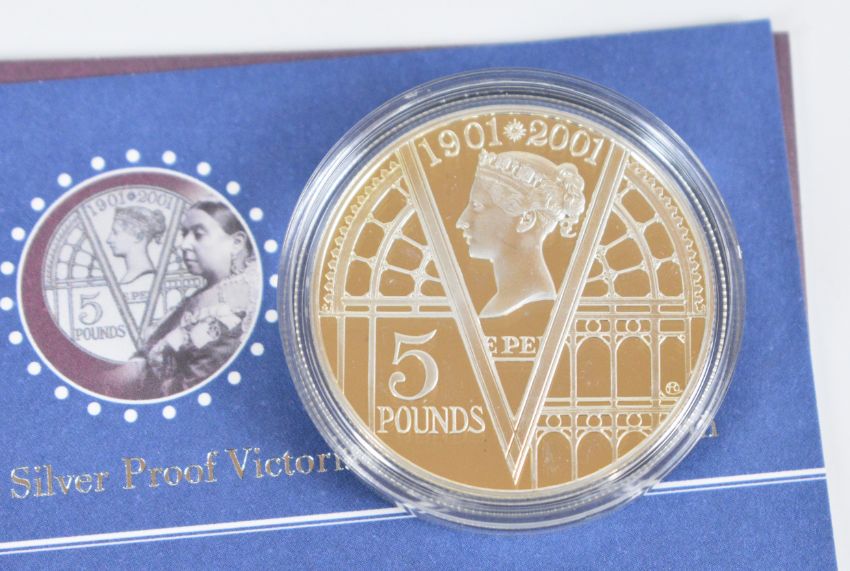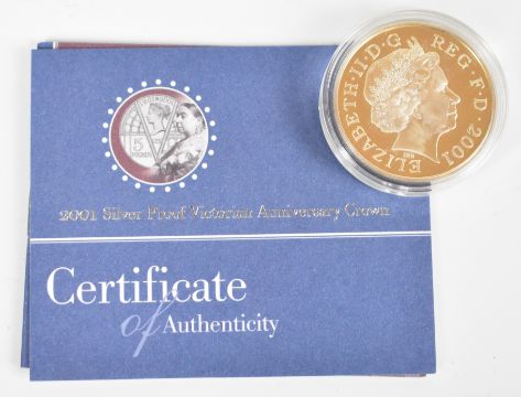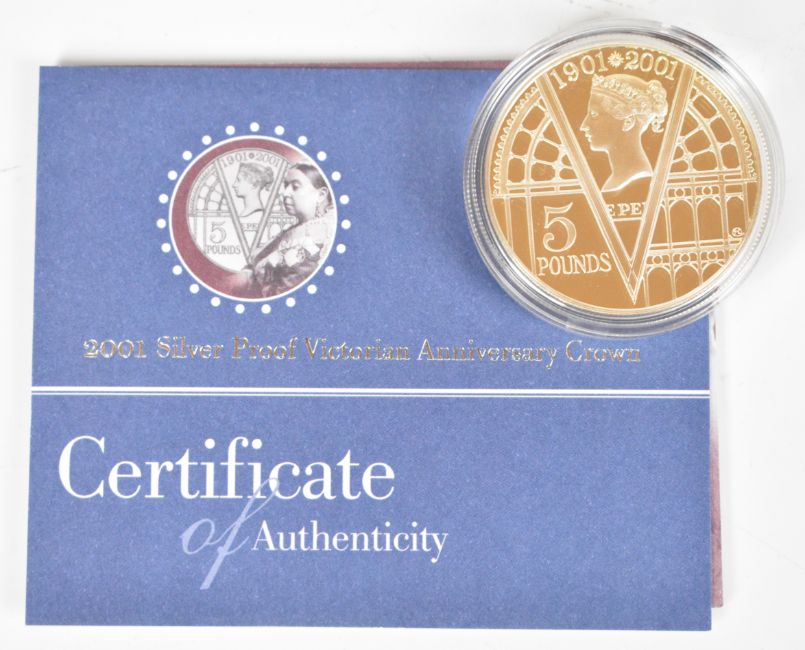 Three Royal Mint silver proof £5 crowns comprising two Victorian Anniversary and one 1900-2022 Queen Elizabeth the Queen Mother memorial crown, all cased with outer packaging