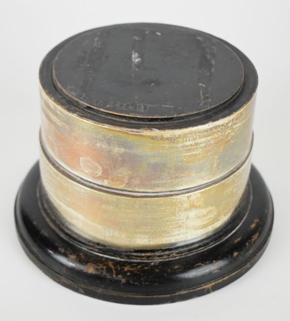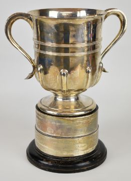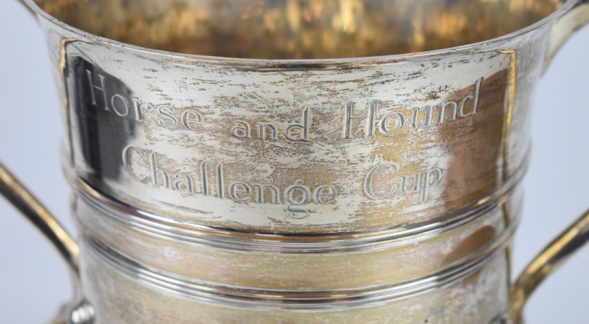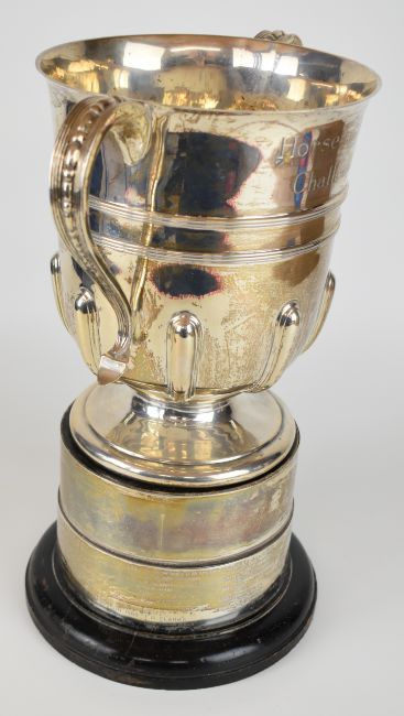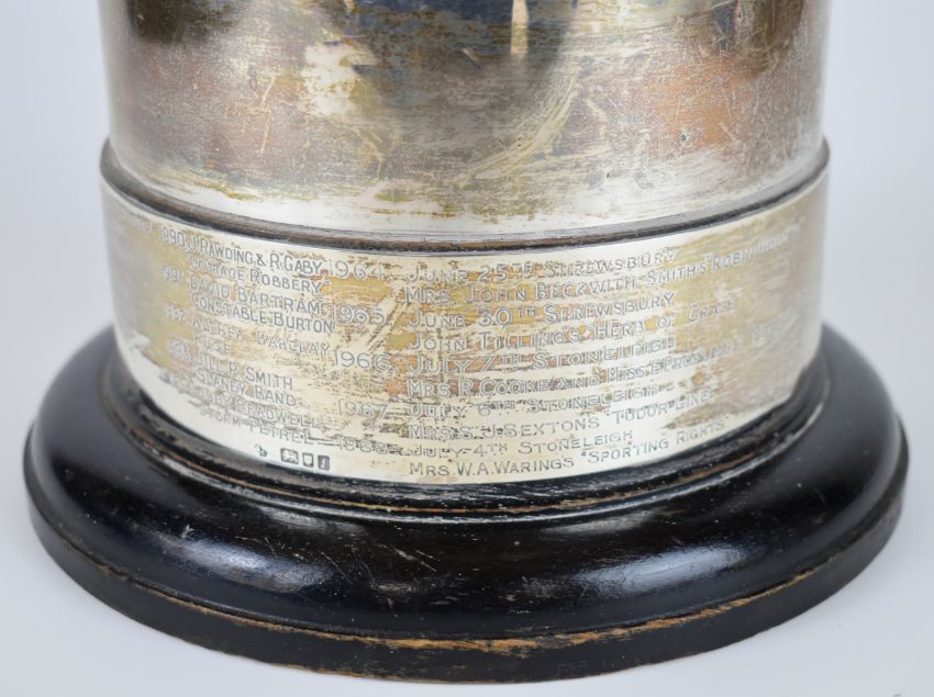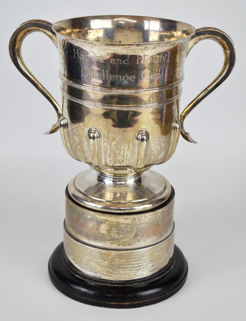 Large Edward VII hallmarked silver twin handled trophy cup with Horse and Hound Challenge Cup engraved to side, London 1905, maker William Comyns & Sons, height 23cm, weight 1565g, on two tier base with names of winners from 1964 to 1997 and engraved Champion Working Hunter Royal Show, overall height on base 36.5cm