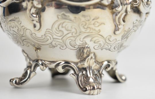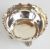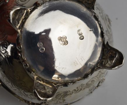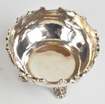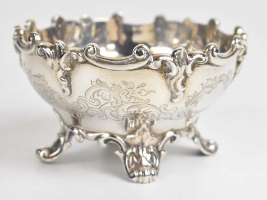 Victorian hallmarked silver bon bon dish or sugar bowl with decorative scrolling rim and engraved decoration, raised on four feet, London 1849, maker John Angell II & George Angell, diameter 9.5cm, height 5cm, weight 110g