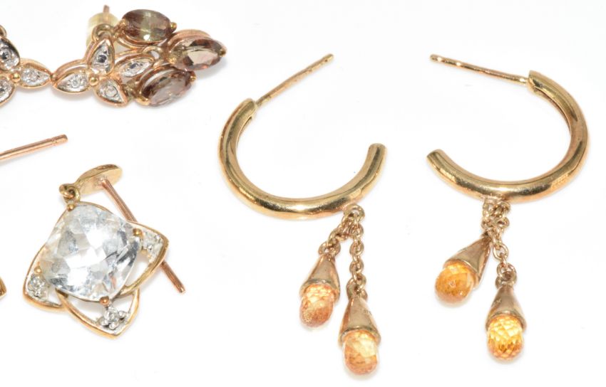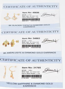 Three pairs of 9ct gold earrings comprising yellow sapphire and diamond, andalusite and diamond and topaz and diamonds, with certificates, 7.5g