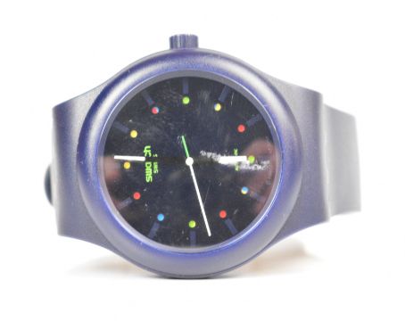 Two wristwatches Swatch automatic ref. WAKTU51 with luminous hands, multi-coloured hour markers, blue dial, case and strap, clear exhibition case back and movement marked 'DONT BE TOO LATE!', case diameter 42mm and Bulova Crystal with luminous gold hands, white dial and quartz movement, on bi-metal bracelet, in original box.