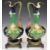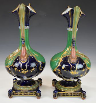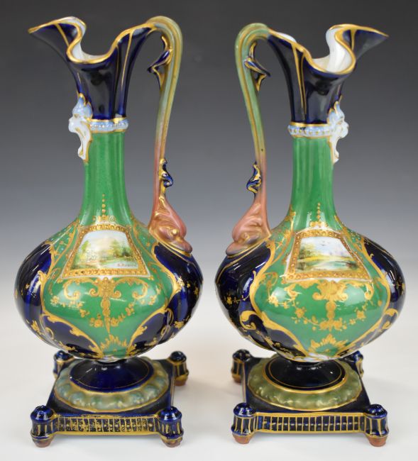 Pair of 19thC Sèvres style French porcelain ewers with hand decorated landscape cartouches signed R Remon and figural dolphin handles, H19.5cm