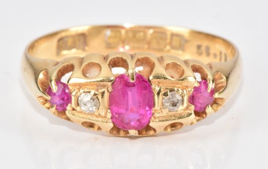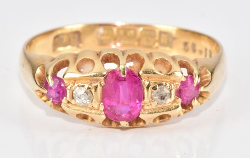 An 18ct gold ring set with three pink sapphires and diamonds, Birmingham 1911, 2.6g, size N