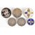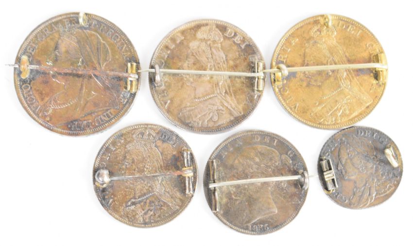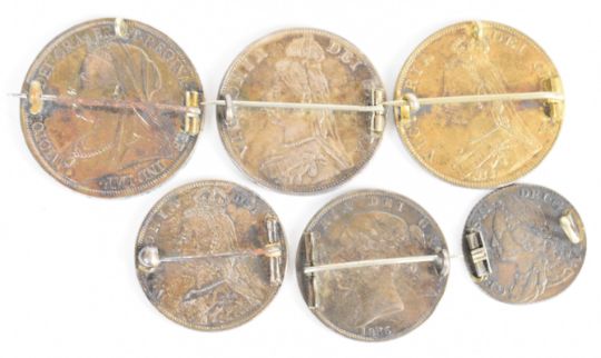Six Georgian and Victorian brooches made from coins including three decorated with enamel, weight of all six 109g all in