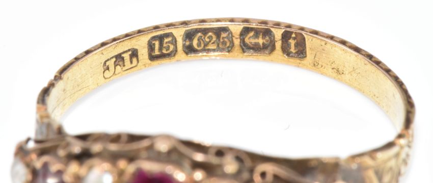 A 15ct gold ring set with paste and split pearls, Birmingham 1883, 2g, size P/Q