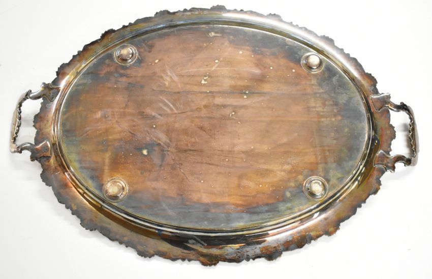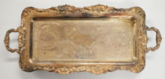 Three silver plated trays including two ornate twin handled examples, largest 72cm