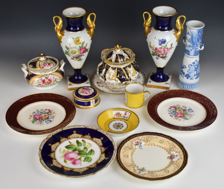 Pair of German twin handled porcelain vases, Chinese vase, 19thC sucriers, Tiffany & Co cabinet plate, Derby / Pinxton coffee can and saucer with damaged handle etc, tallest 28cm