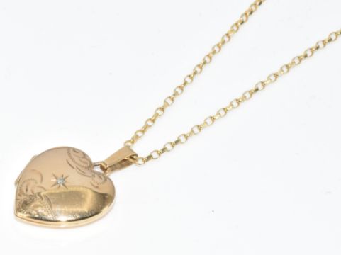 A 9ct gold heart shaped locket set with a diamond on 9ct gold chain, 3.8g, 44cm