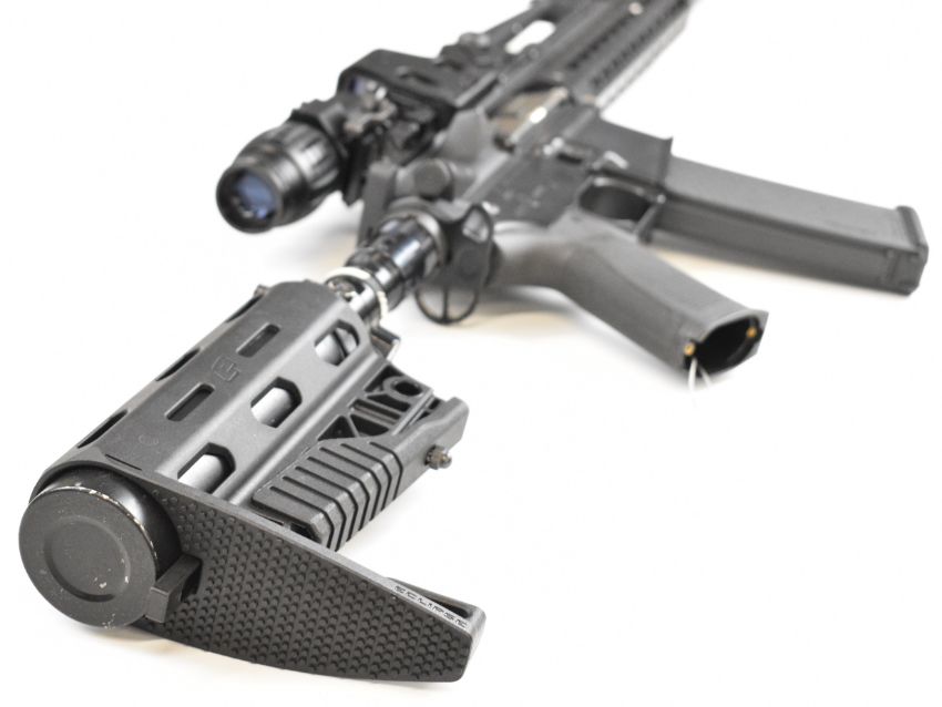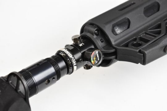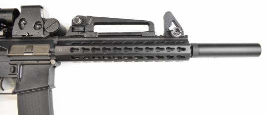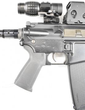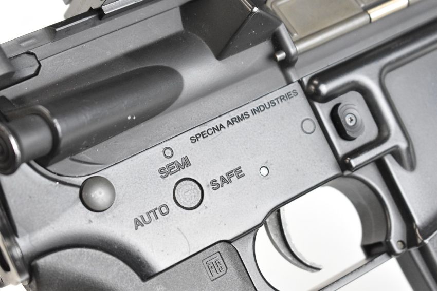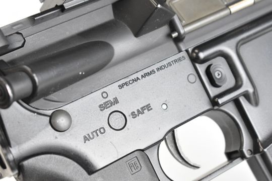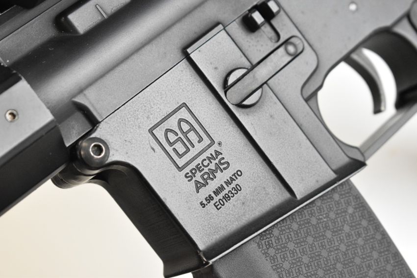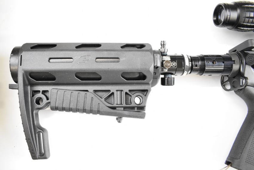 Specna Arms 5.56mm Nato airsoft rifle with textured composite pistol grip, HK Army 4500 PSI CObottle, tactical stock, LMT grenade launcher, four curved magazines, bi-pod, sound moderator, red hot holographic sights and scope, serial number E019330, in Zero One Airsoft Rugged Carry 105 padded carry case with accessories.