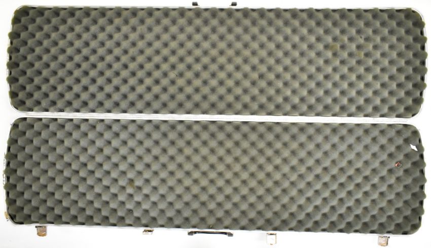 Two shotgun or rifle hard carry cases with padded interiors, one with decoration of rams, largest 130cm long.