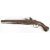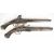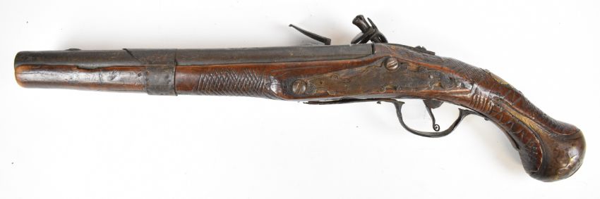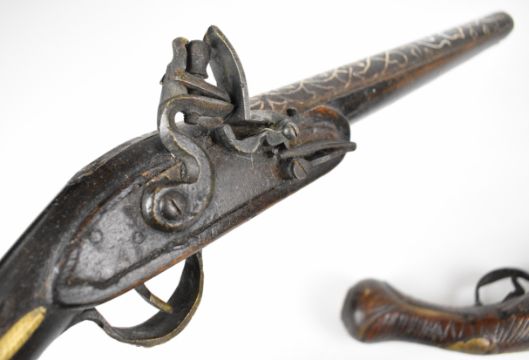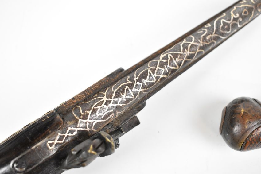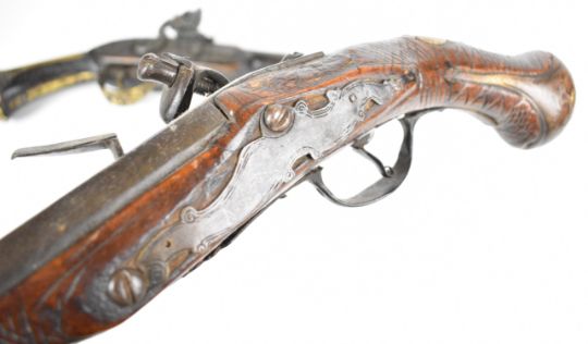 Two flintlock pistols one with indistinctly named lock, chequered grip, brass butt cap, wrist cartouche and 10.25 inch barrel, the other with embossed brass trigger guard and butt cap and 11 inch silver inlaid barrel.