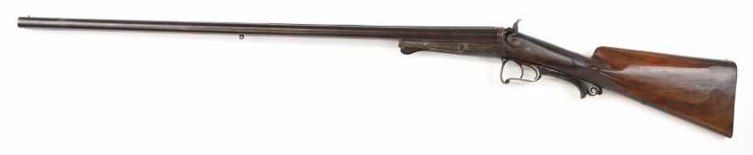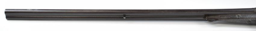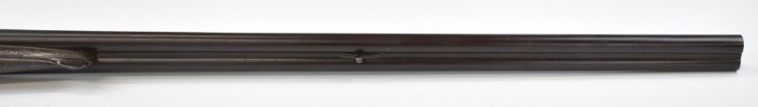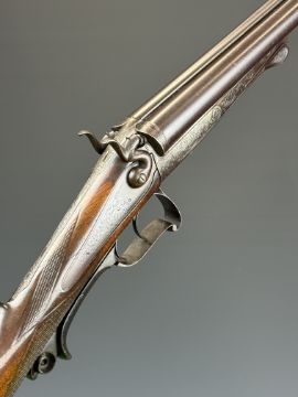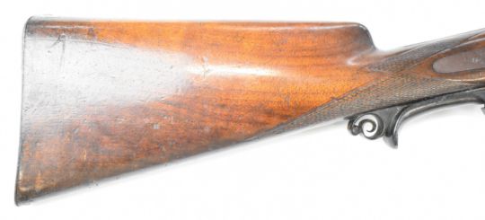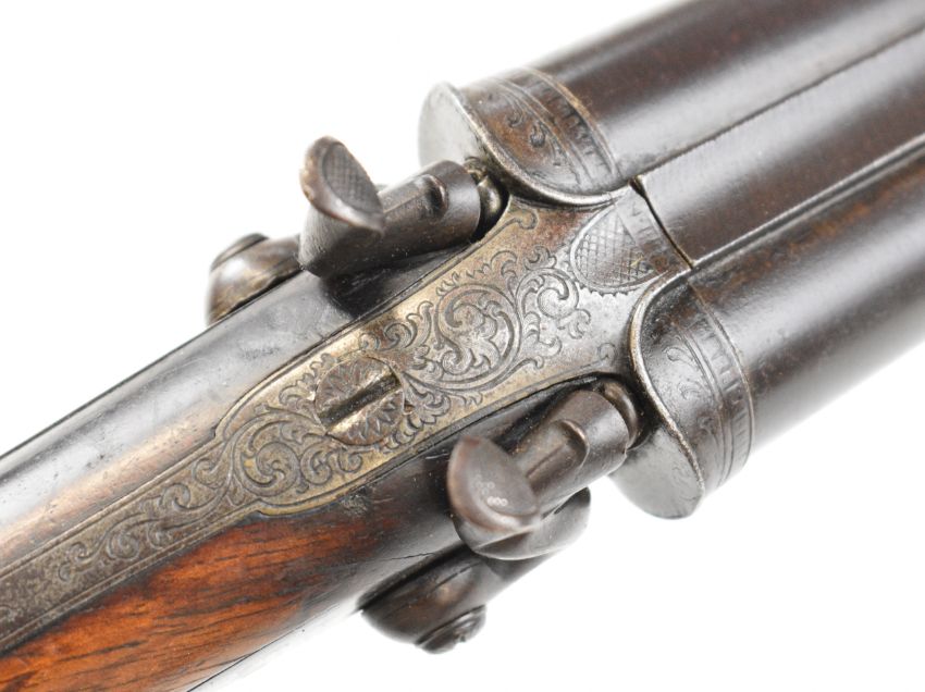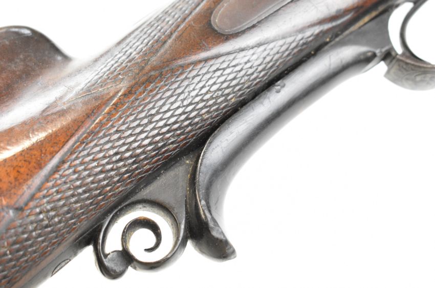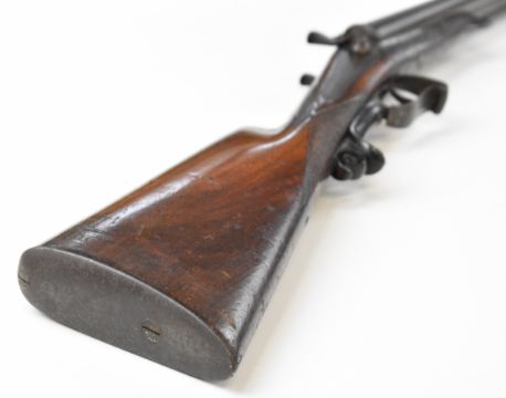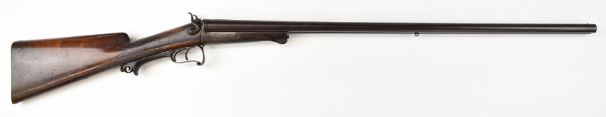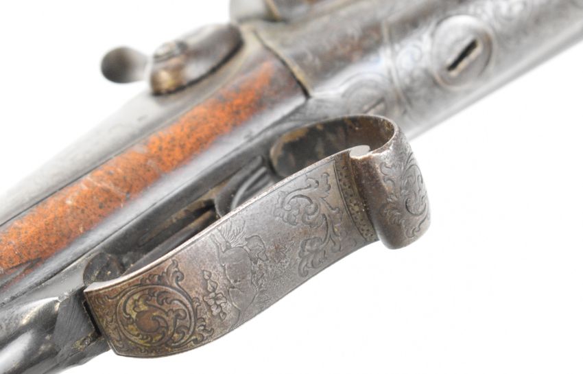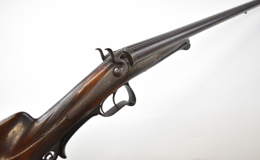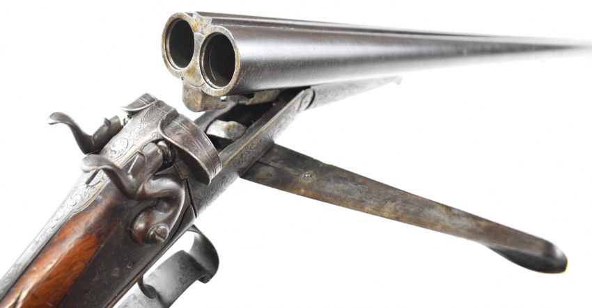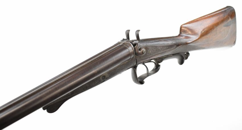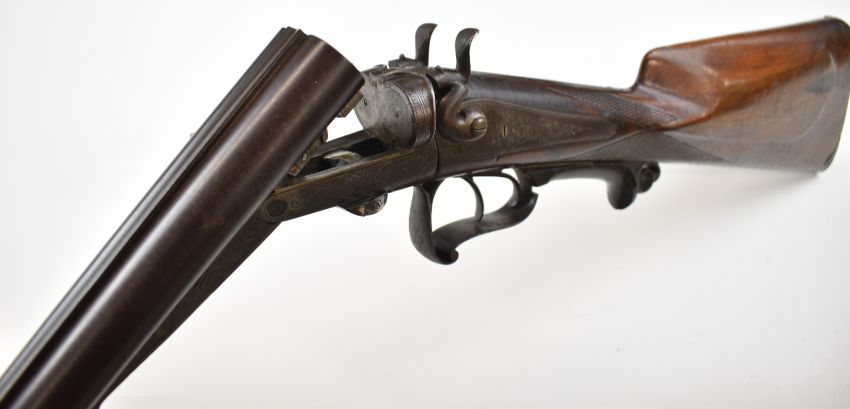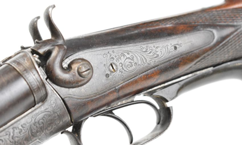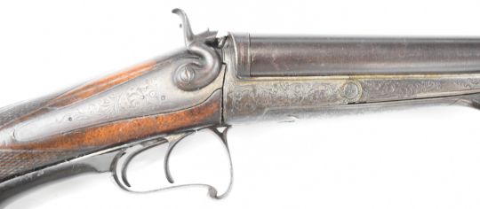 Carl Guntermann of Dusseldorf Lefauchaux patent 16 bore side by side hammer action shotgun with engraved scenes of dogs to the scrolling trigger guard, engraved locks, action, top strap, underlever and hammers, scrolling horn extension to the trigger guard, chequered grip and double trigger, length of pull 35.5cm, serial number 5245. PLEASE NOTE THAT THIS GUN IS BEING SOLD AS STOCK AND ACTION ONLY AND THAT A VALID RELEVANT RFD CERTIFICATE IS REQUIRED TO VIEW OR PURCHASE THIS LOT.