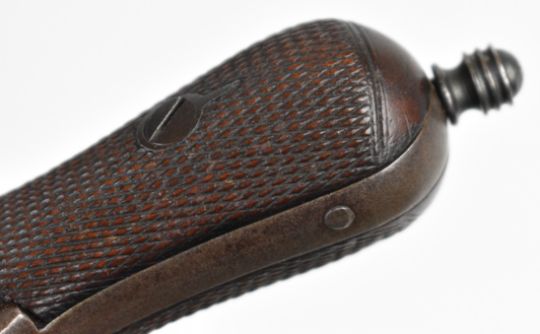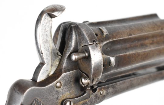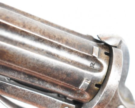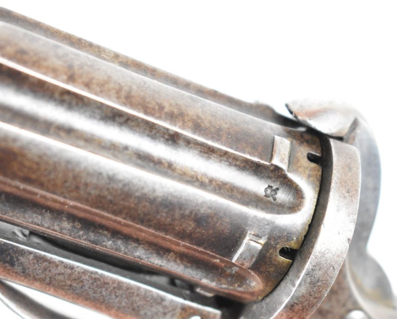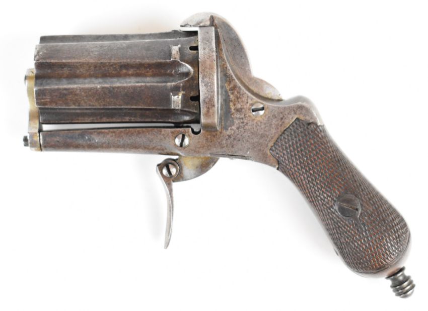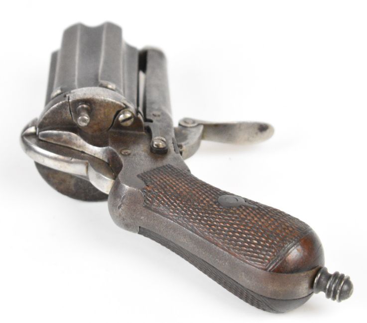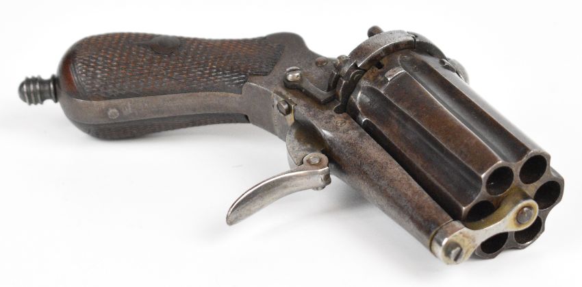 Unnamed 7mm six-shot pinfire hammer action pepperbox pistol / revolver with chequered wooden grips, ram-rod inset to the butt, folding trigger and 2 inch smooth bored barrels, overall length 14cm.
