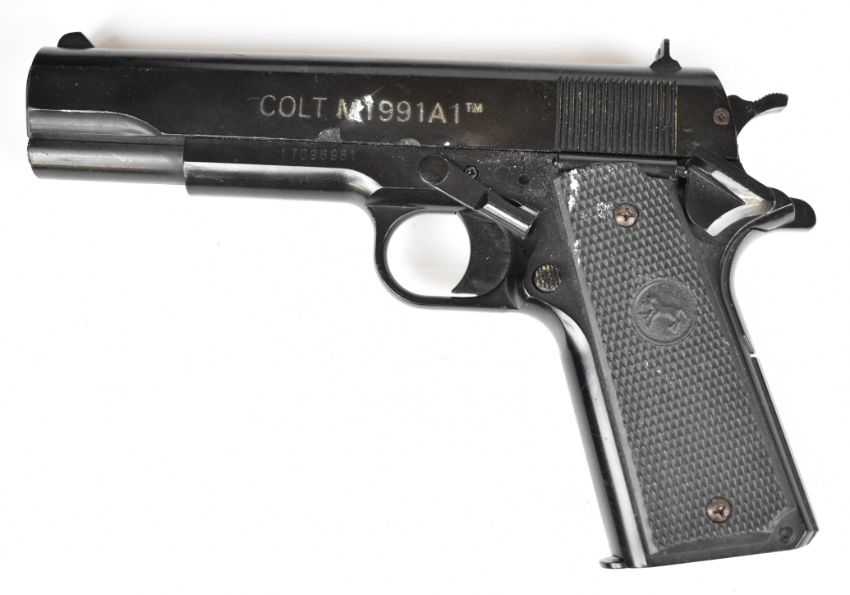 Six replica guns and pistols comprising a blunderbuss and pair of brass barrelled pistols all with carved wooden stocks, broom handled Mauser, Colt M1991 A1 and a Denix TE 6215 1950 pistol.