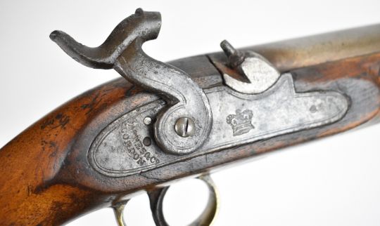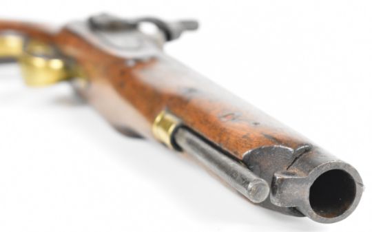 Barnes & Co of London percussion hammer action Dragoon pistol with lock stamped 'Barnes & Co London' and with crown cypher, brass trigger guard, wooden ram-rod and 8.5 inch smooth bored barrel, overall length 37cm.
