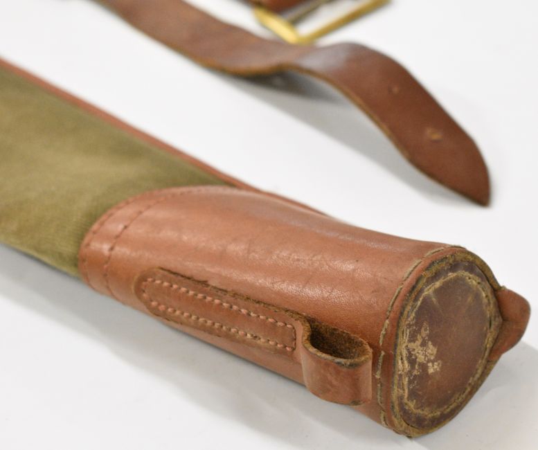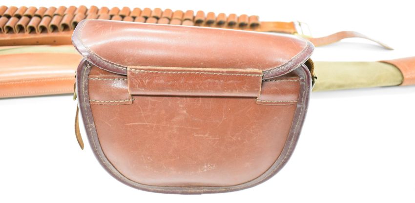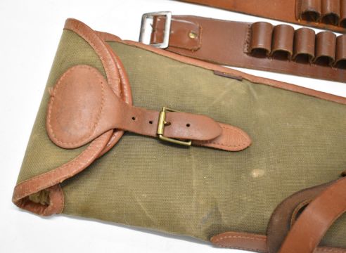 Leather and canvas shotgun or rifle slip, leather shotgun cartridge bag and two 12 bore cartridge belts.