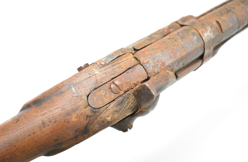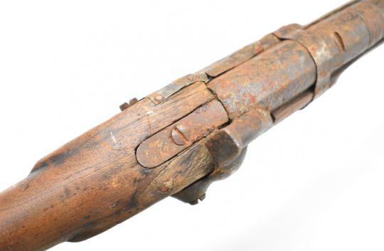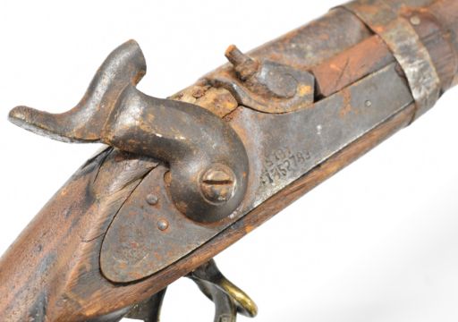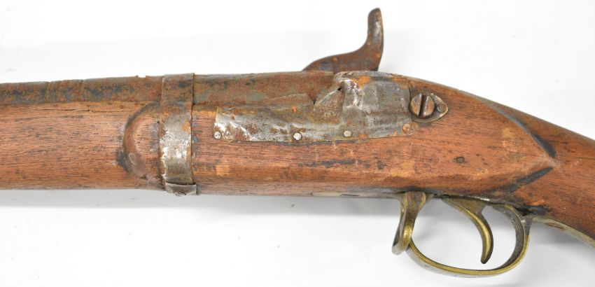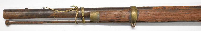 Enfield pattern three-band percussion hammer action gun with various numbers and a crown stamped to the lock, semi-pistol grip, brass trigger guard, horn butt plate storage compartment to the stock, sling mounts and 40 inch smooth bored barrel, overall length 143cm.
