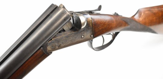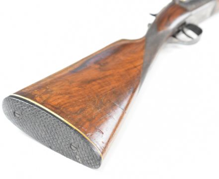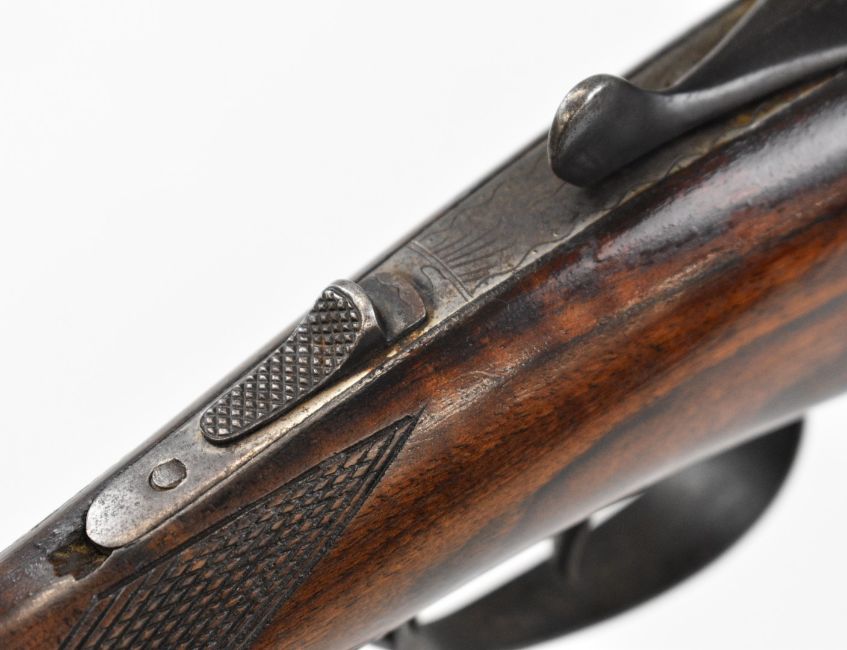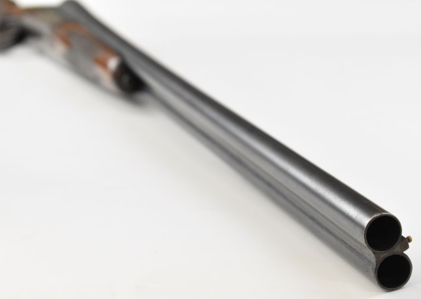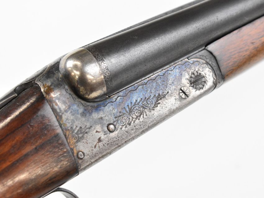 Spanish 20 bore side by side shotgun with engraved lock, underside, trigger guard, top plate, thumb lever and fences, chequered grip and forend, double trigger and 25.5 inch barrels choked ¼ and ¾, overall length 108cm, length of pull 36cm, serial number 8841. PLEASE NOTE THAT A VALID RELEVANT SHOTGUN CERTIFICATE IS REQUIRED TO VIEW OR PURCHASE THIS LOT AND FOR ALL SHOTGUNS OR RIFLES. PLEASE ENSURE YOU HAVE THE RELEVANT CERTIFICATE BEFORE BIDDING.