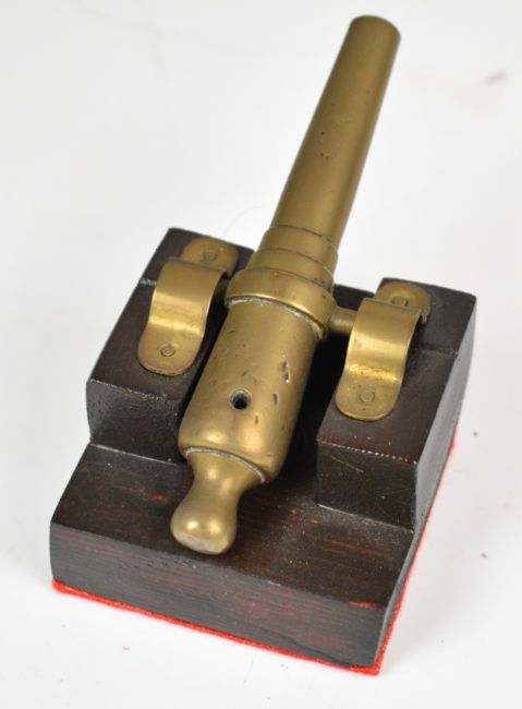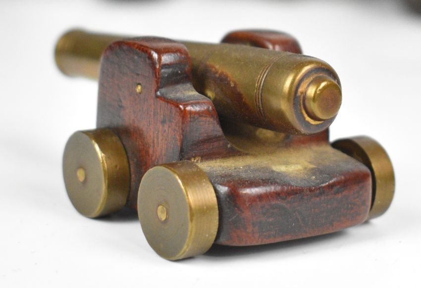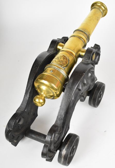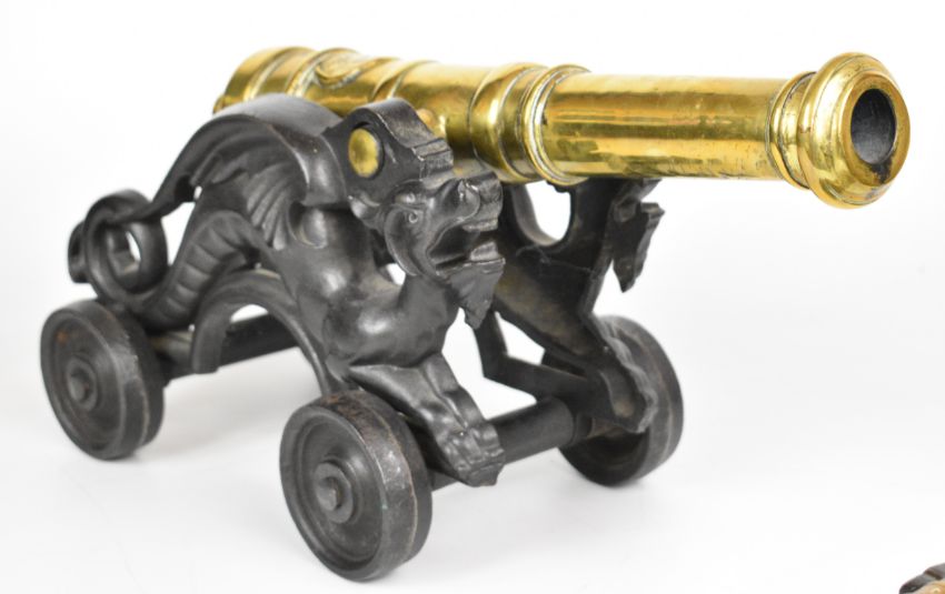 Four model desk or signalling cannon, the largest with cast iron base in the form of dragons and 15.5 inch barrel, the three smaller examples raised on wooden carriages.