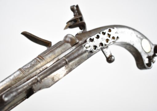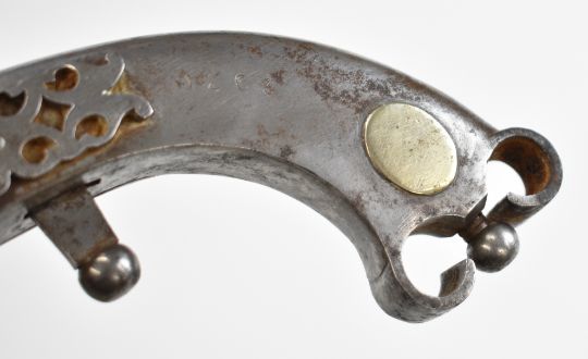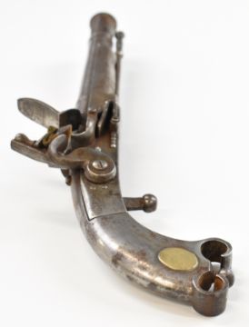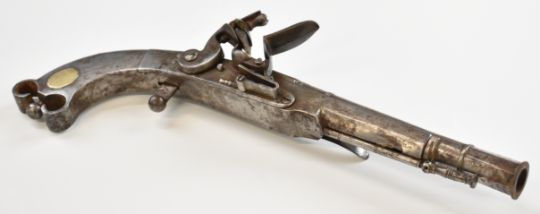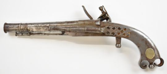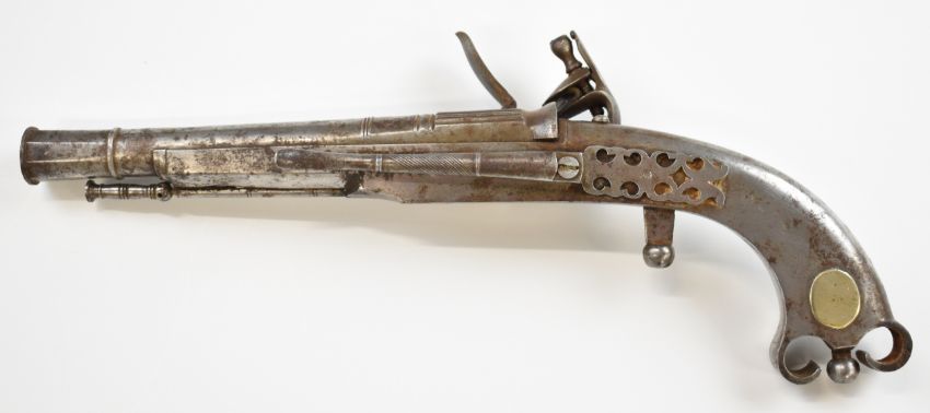 Unnamed Scottish Doune style flintlock belt pistol with metal body, scrolling butt, steel ram-rod, belt hook and 7.5 inch smooth bored cannon barrel, overall length 33cm, serial number 1263. PLEASE NOTE THAT A VALID RELEVANT FIREARMS CERTIFICATE IS REQUIRED TO VIEW OR PURCHASE THIS LOT AND FOR ALL SHOTGUNS OR RIFLES PLEASE ENSURE YOU HAVE THE RELEVANT CERTIFICATE BEFORE BIDDING