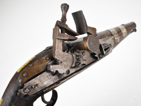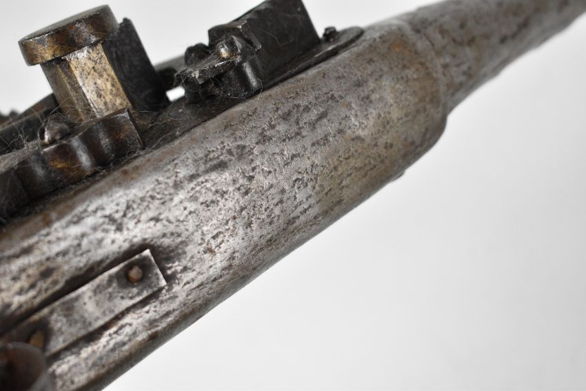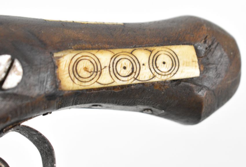 Two Eastern flintlock pistols, both with Roman style lock and bone inlaid decoration to the stock, one with white metal barrel bands and 8 inch barrel, the other with 12.5 inch barrel.