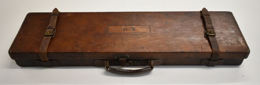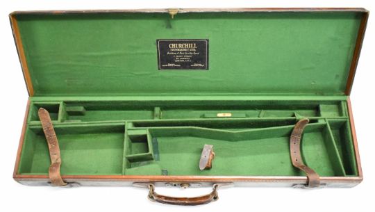 Leather bound shotgun carry case with fitted interior and 'Churchill (Gunmakers) Ltd Builders of Best Quality Guns 7 Bury Street St James's London S.W.1.' label, 83.5 x 23 x 8.5cm.