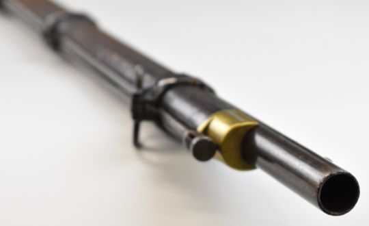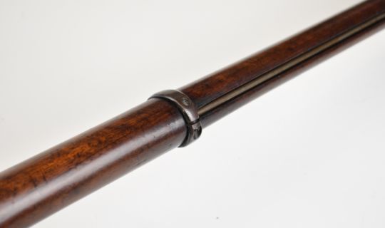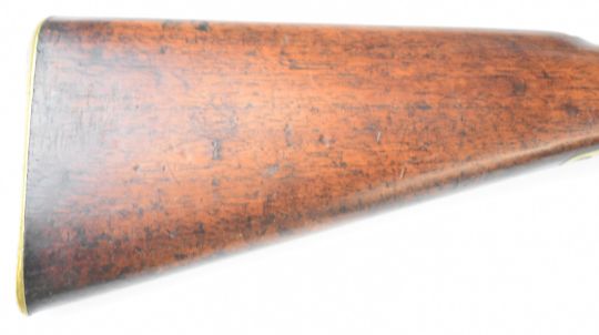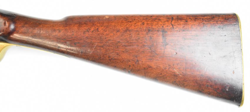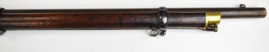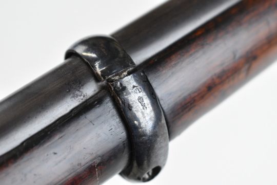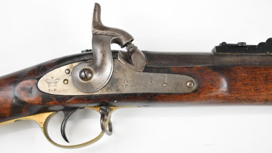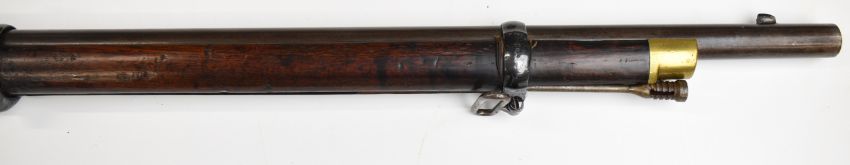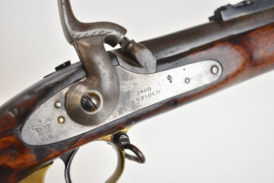 Enfield 3-band .577 muzzle loading percussion hammer action rifle with lock stamped '1860 Enfield' and with crown over 'VR' cypher, adjustable folding ladder sights, brass trigger guard and butt plate, sling suspension loops and 39 inch rifled barrel, overall length 137cm.