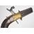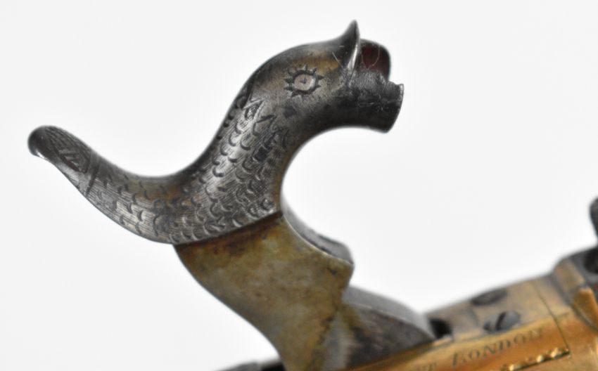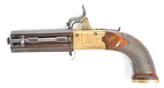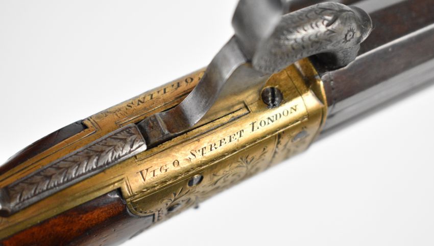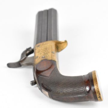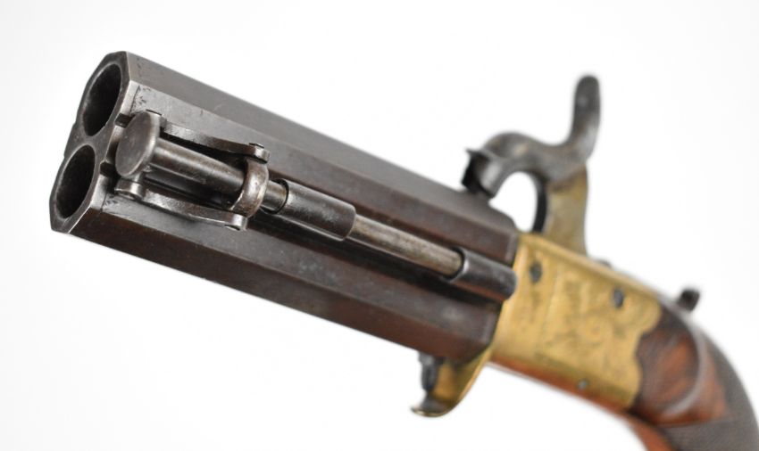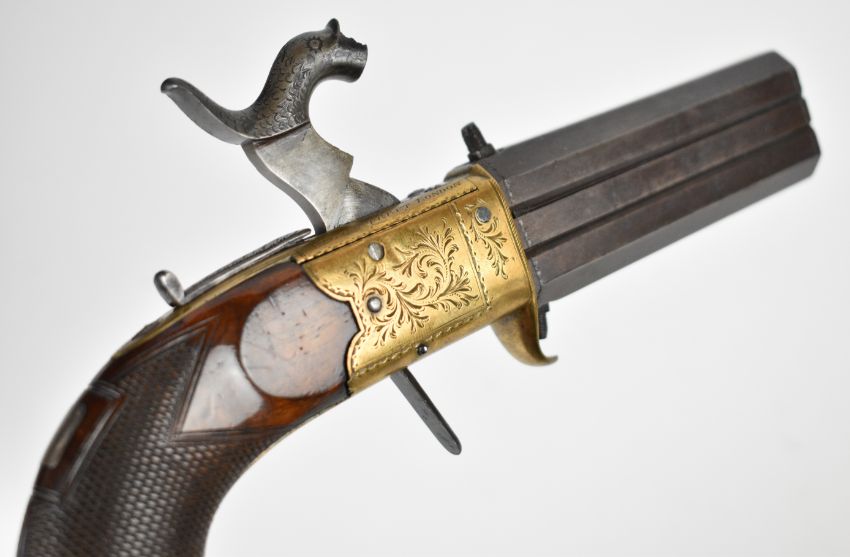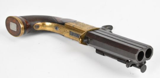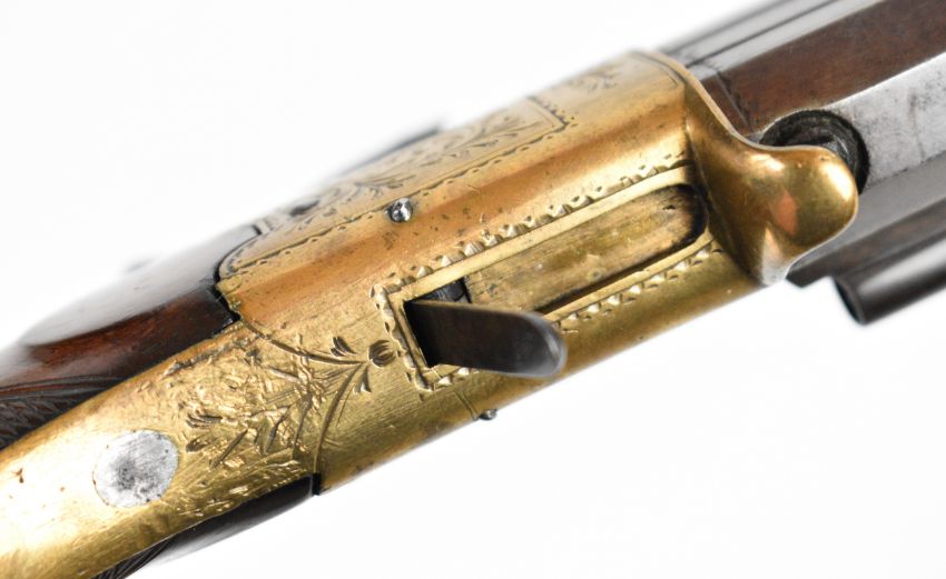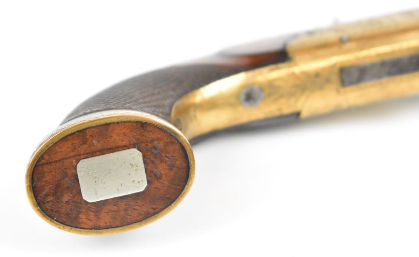 Collins of London 24 bore percussion hammer action double barrelled over and under pocket pistol with engraved brass frame, thumb-slide safety, butt cap rim and stylised dolphin hammer, top flat engraved 'Collins' and Vigo Street London', vacant wrist and butt cartouches, folding trigger, captive ram-rod and 3.25 inch smooth bored hand-rotated barrels, overall length 22cm.