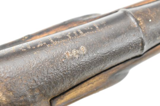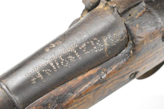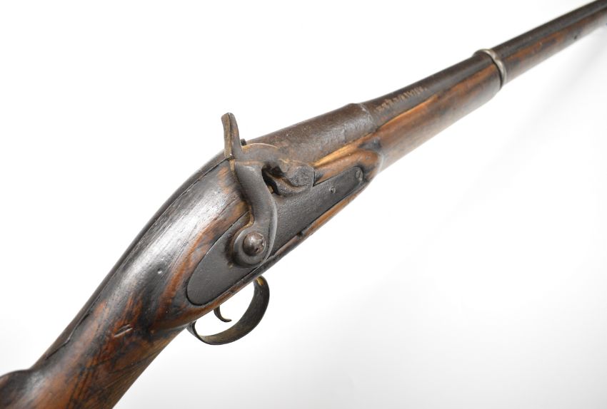 Eastern Enfield pattern percussion hammer action gun with chequered grip, steel ram-rod, storage compartment to the stock, sling mounts and indistinctly marked 36 inch smooth bored barrel, overall length 132cm.