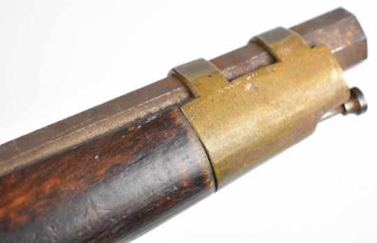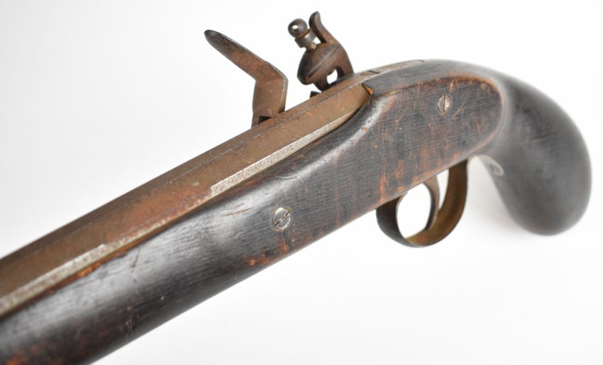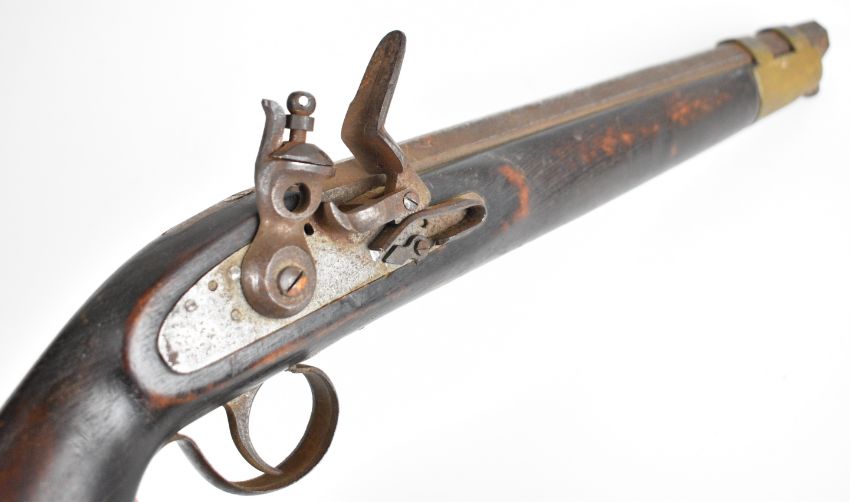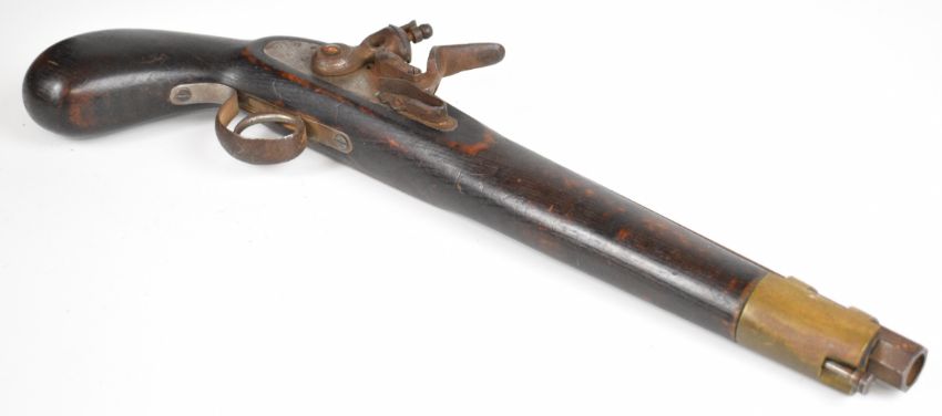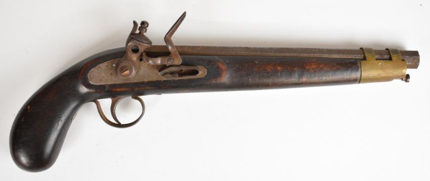 Unnamed flintlock pistol with brass barrel band and 11 inch smooth bored octagonal barrel, overall length 41.5cm.