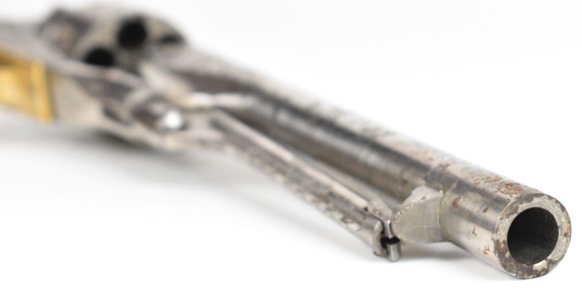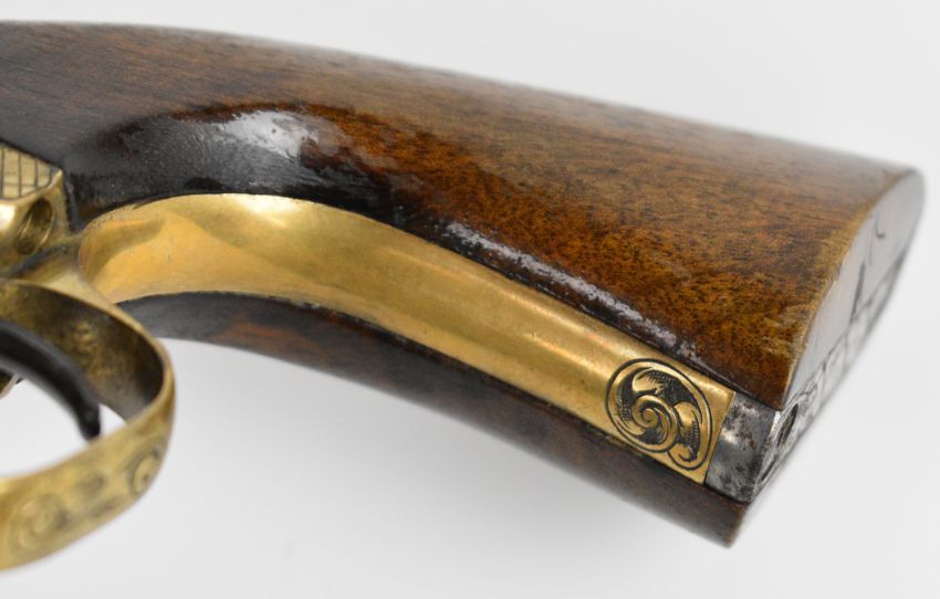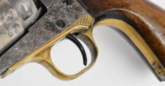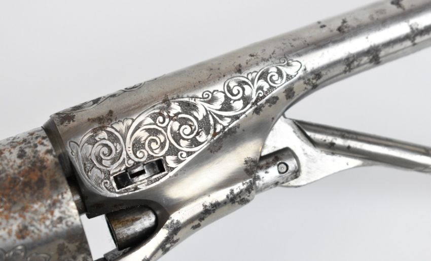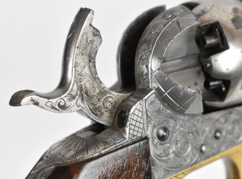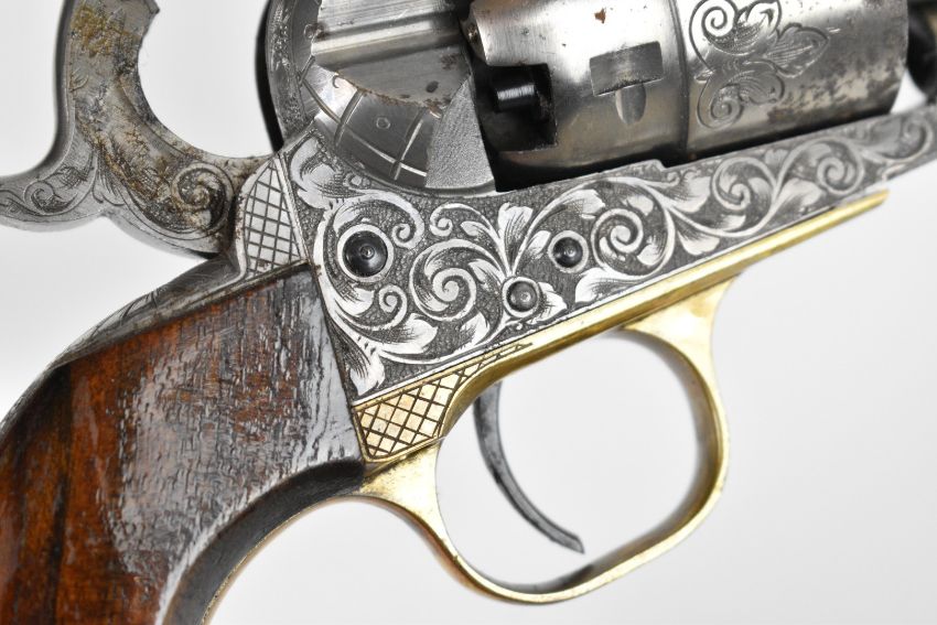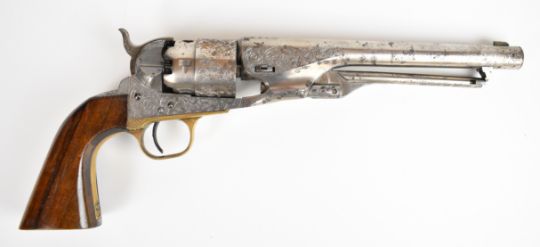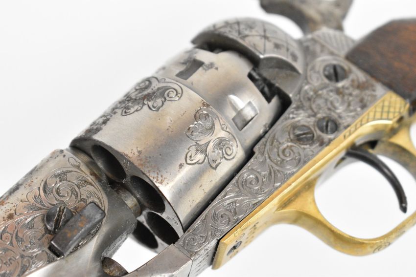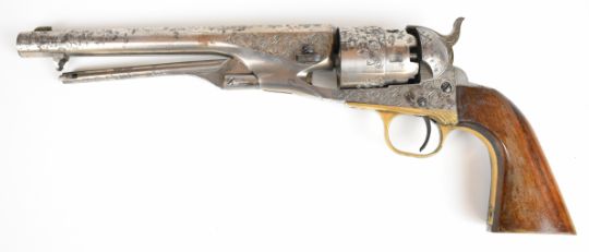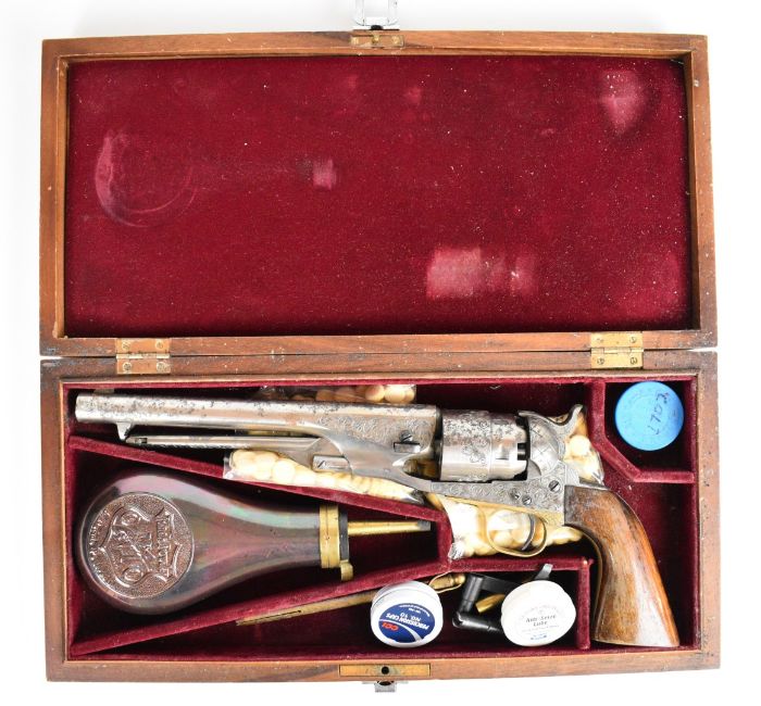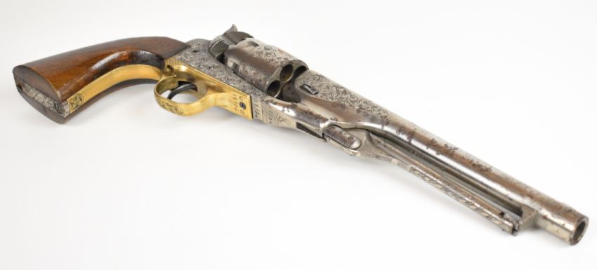 Colt Navy style.44 six shot single-action percussion revolver with ornately engraved frame and cylinder, wooden grips, brass trigger guard and 7.75 inch barrel, overall length 36cm, serial number 11184, in fitted wooden case with copper and brass embossed powder flask and accessories. PLEASE NOTE THAT A VALID RELEVANT FIREARMS CERTIFICATE IS REQUIRED TO VIEW OR PURCHASE THIS LOT AND FOR ALL SHOTGUNS OR RIFLES PLEASE ENSURE YOU HAVE THE RELEVANT CERTIFICATE BEFORE BIDDING.