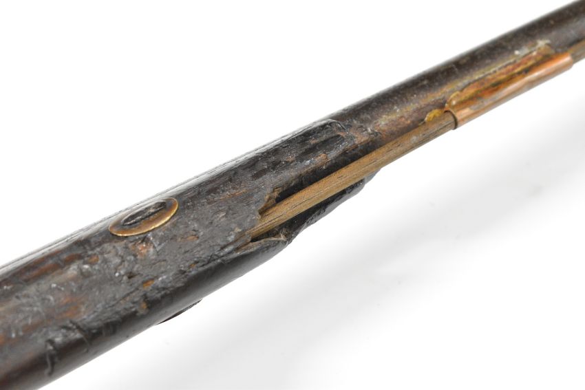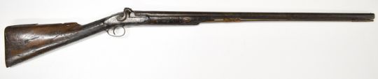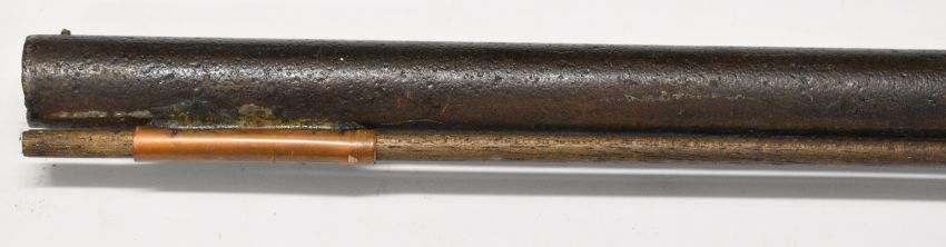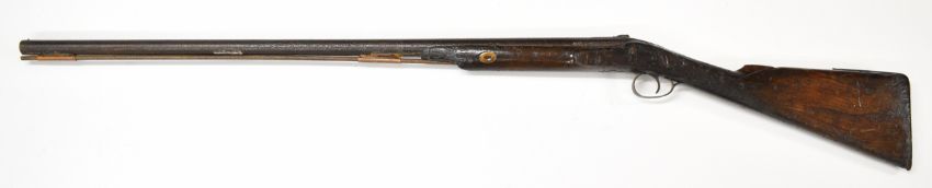 Indistinctly named percussion hammer action sporting gun with lock, chequered grip, wooden ram-rod and 32 inch smooth bored barrel, overall length 122cm.