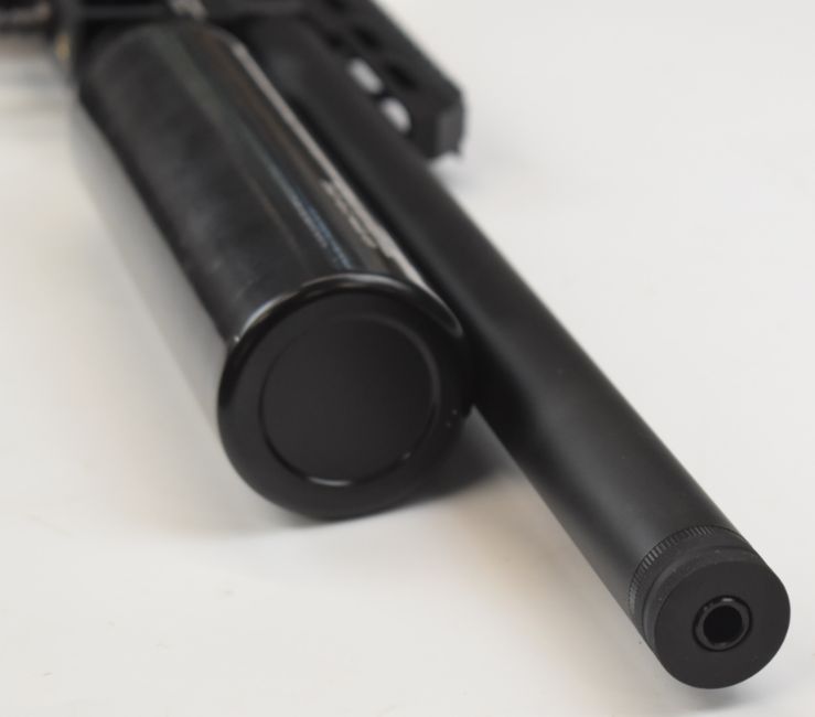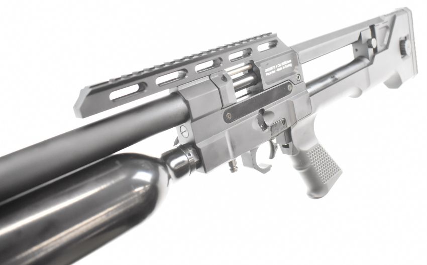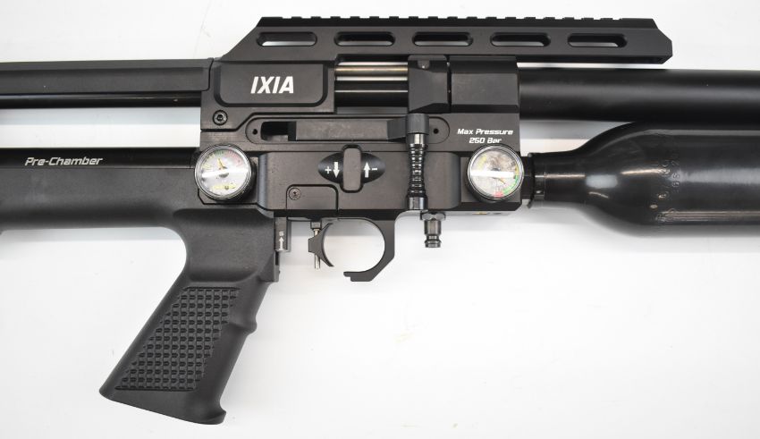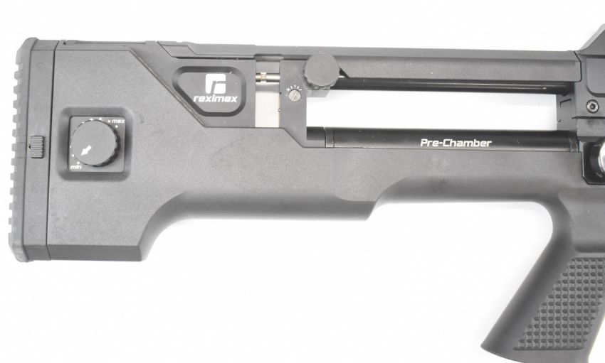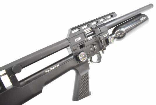 Reximex IXIA .22 PCP carbine air rifle with textured pistol grip, composite skeleton stock, 14 shot magazine, adjustable trigger and butt plate and scope rail, serial number 21112870, in original case with tags, instructions, accessories and cap. PLEASE NOTE IF YOU REQUIRE POSTAGE ALL POST 1939 AIR GUNS CAN ONLY BE SENT TO AN RFD.